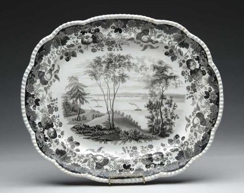BLACK AND WHITE TRANSFER STAFFORDSHIRE PLATTER. “Bay of New York from Staten Island”. Enoch Wood & Sons. The platter having a fruit border and the center section showing New York Harbor with ships and trees in foreground. Back with black title marked “EWS Celtic China”. A wonderful crisp view. SIZE: 18-1/2” x 15-1/2”. CONDITION: Very good. 9-27037