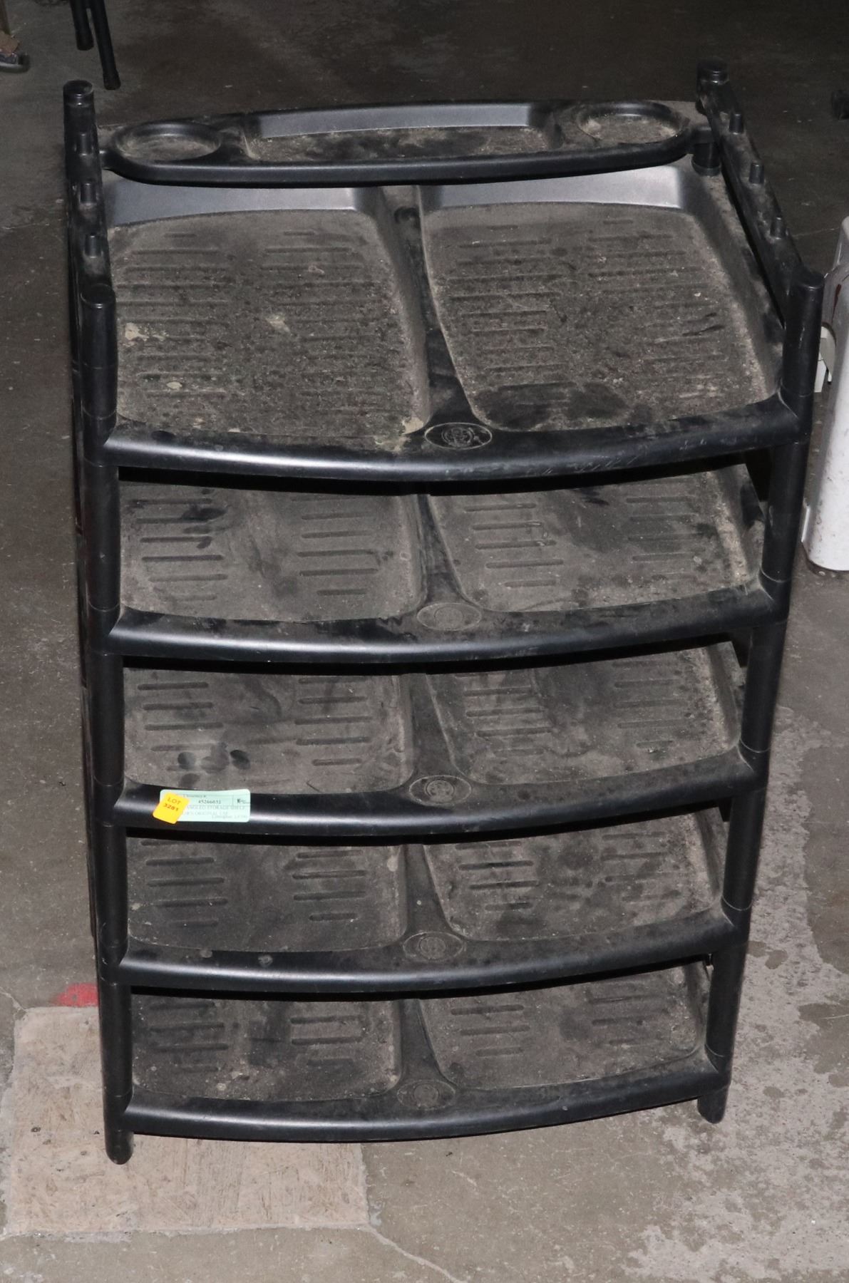 BLACK ANGLED STORAGE SHELF, UNKNOWN ORIGINAL USE