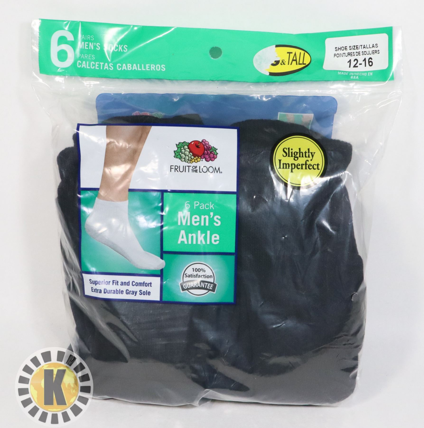 BLACK ANKLE SOCKS,12-16,PACK OF 6,FRUIT OF THE
