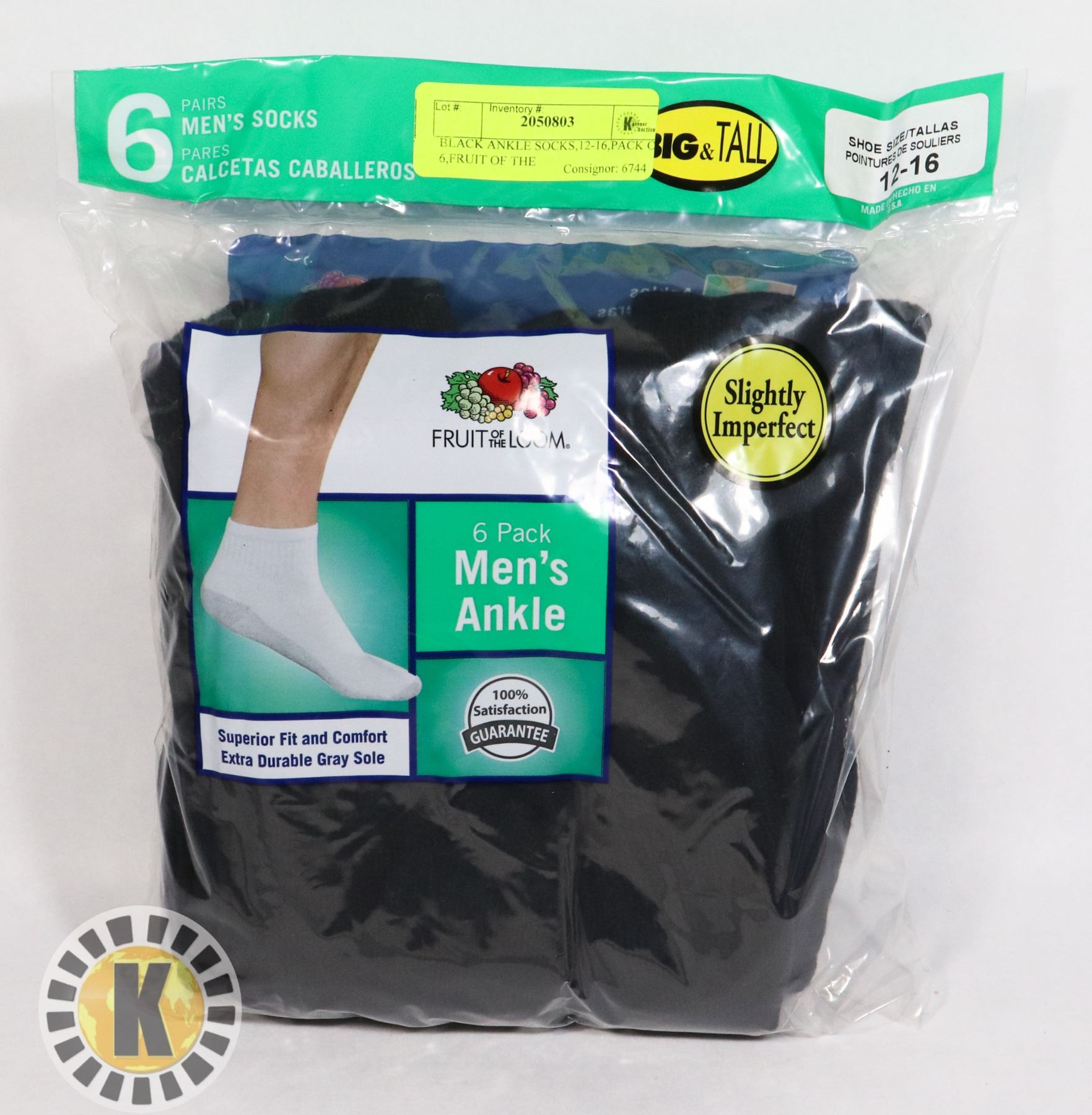 BLACK ANKLE SOCKS,12-16,PACK OF 6,FRUIT OF THE
