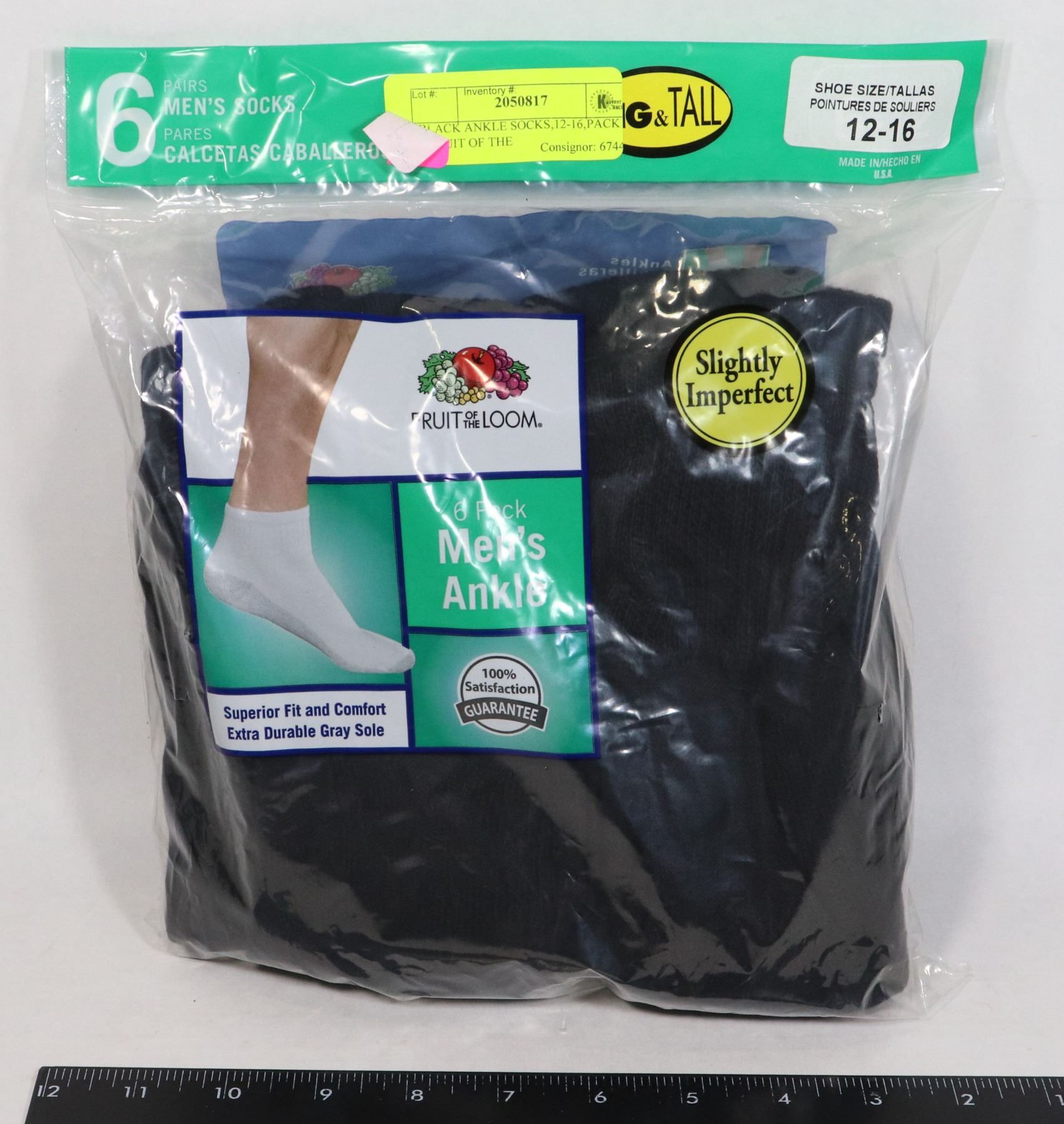 BLACK ANKLE SOCKS,12-16,PACK OF 6,FRUIT OF THE