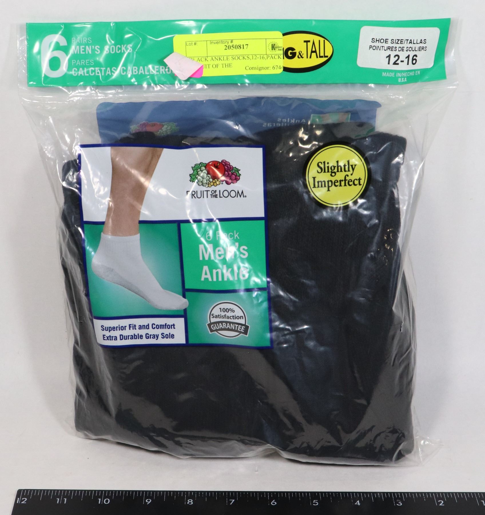 BLACK ANKLE SOCKS,12-16,PACK OF 6,FRUIT OF THE