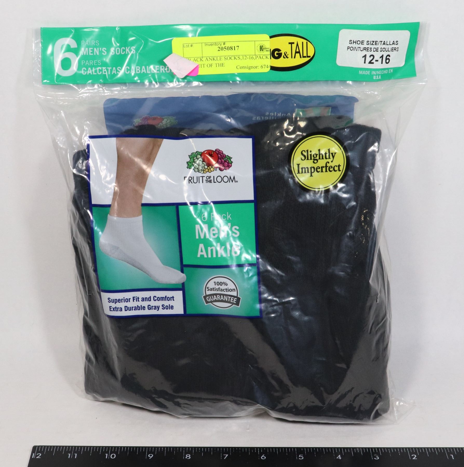BLACK ANKLE SOCKS,12-16,PACK OF 6,FRUIT OF THE