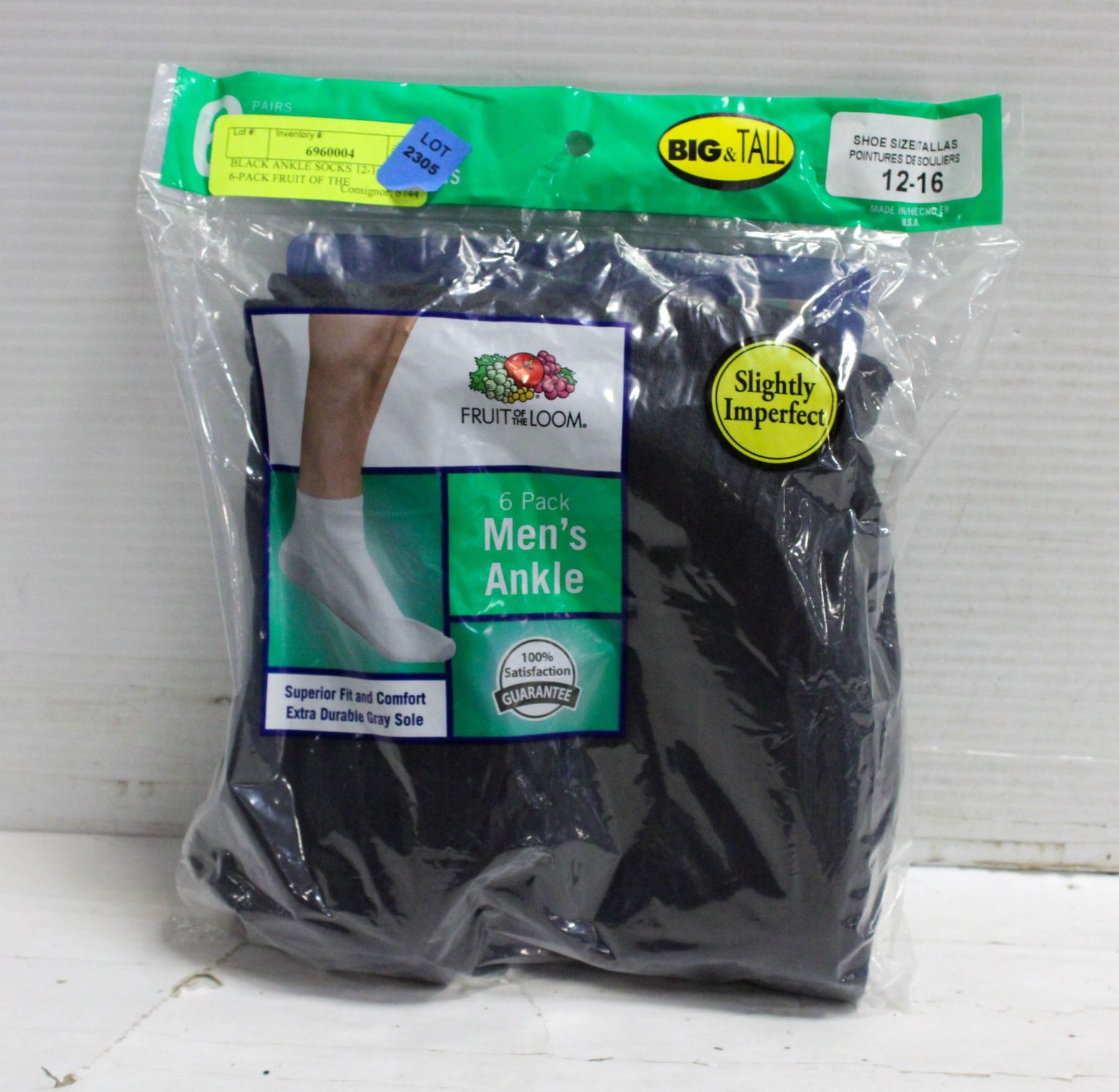BLACK ANKLE SOCKS 12-16 SIZE 6-PACK FRUIT OF THE