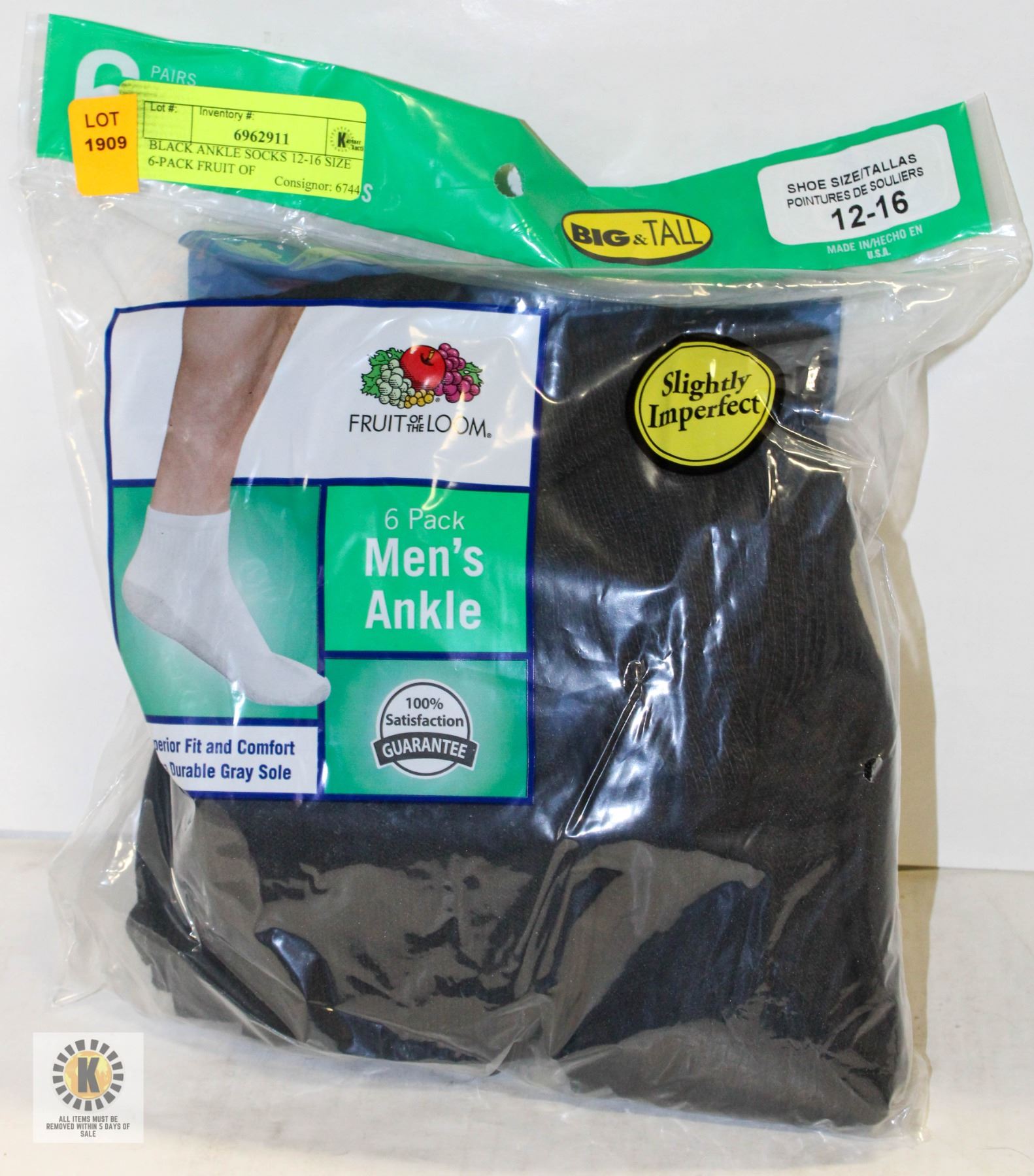 BLACK ANKLE SOCKS 12-16 SIZE 6-PACK FRUIT OF