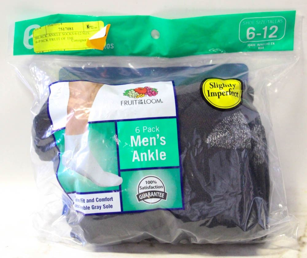 BLACK ANKLE SOCKS 6-12 SIZE 6-PACK FRUIT OF THE