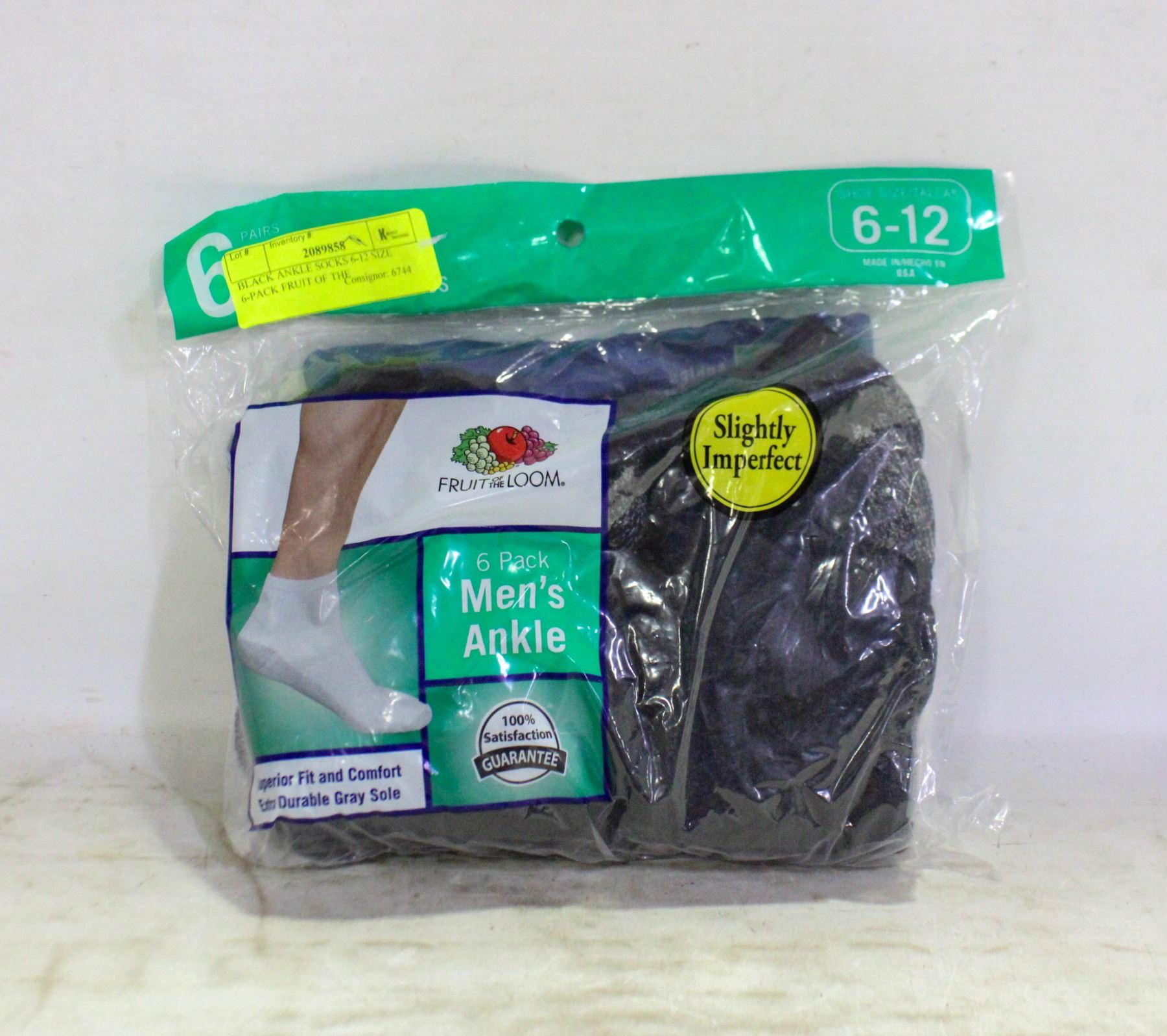 BLACK ANKLE SOCKS 6-12 SIZE 6-PACK FRUIT OF THE