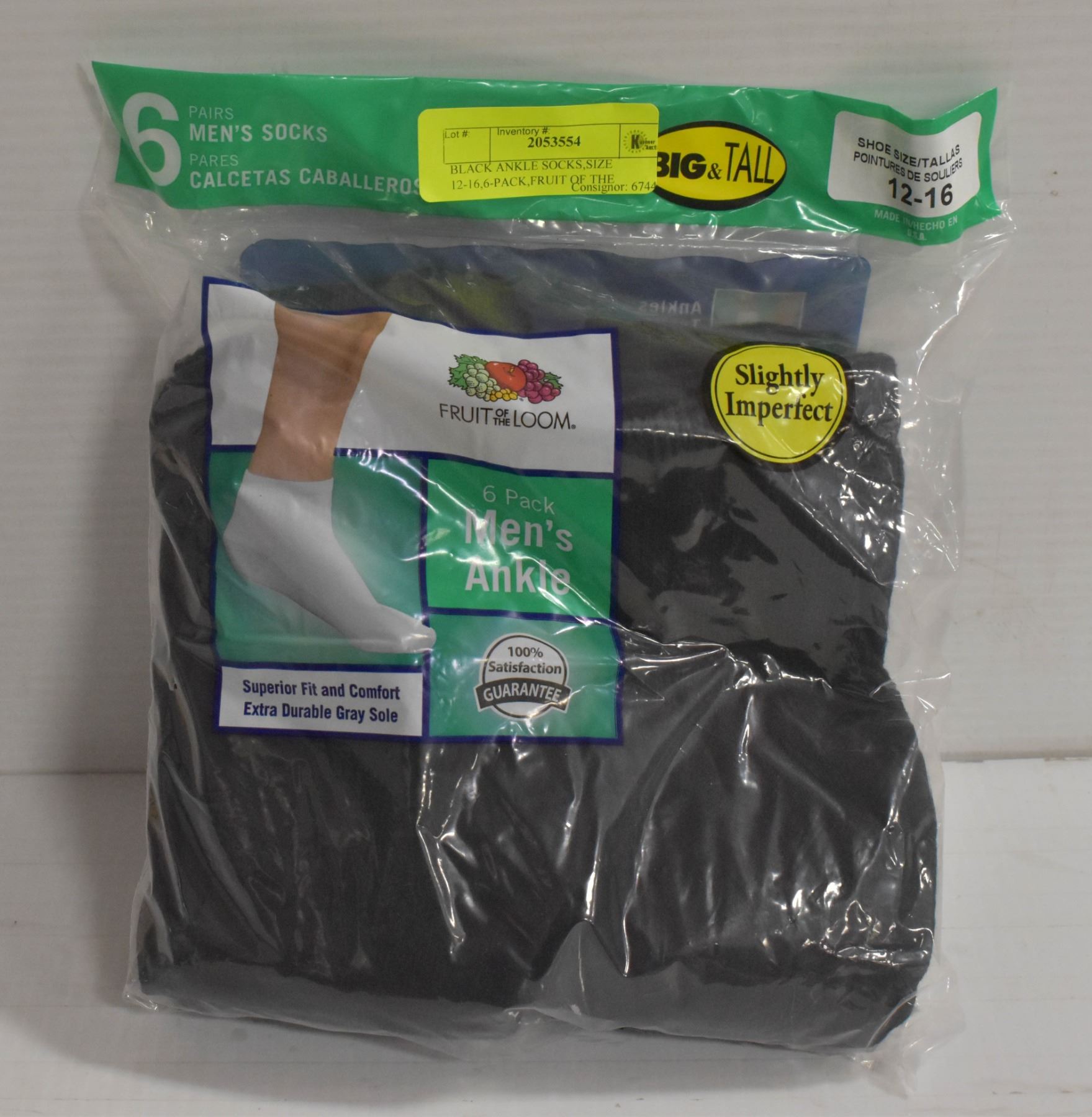BLACK ANKLE SOCKS,SIZE 12-16,6-PACK,FRUIT OF THE