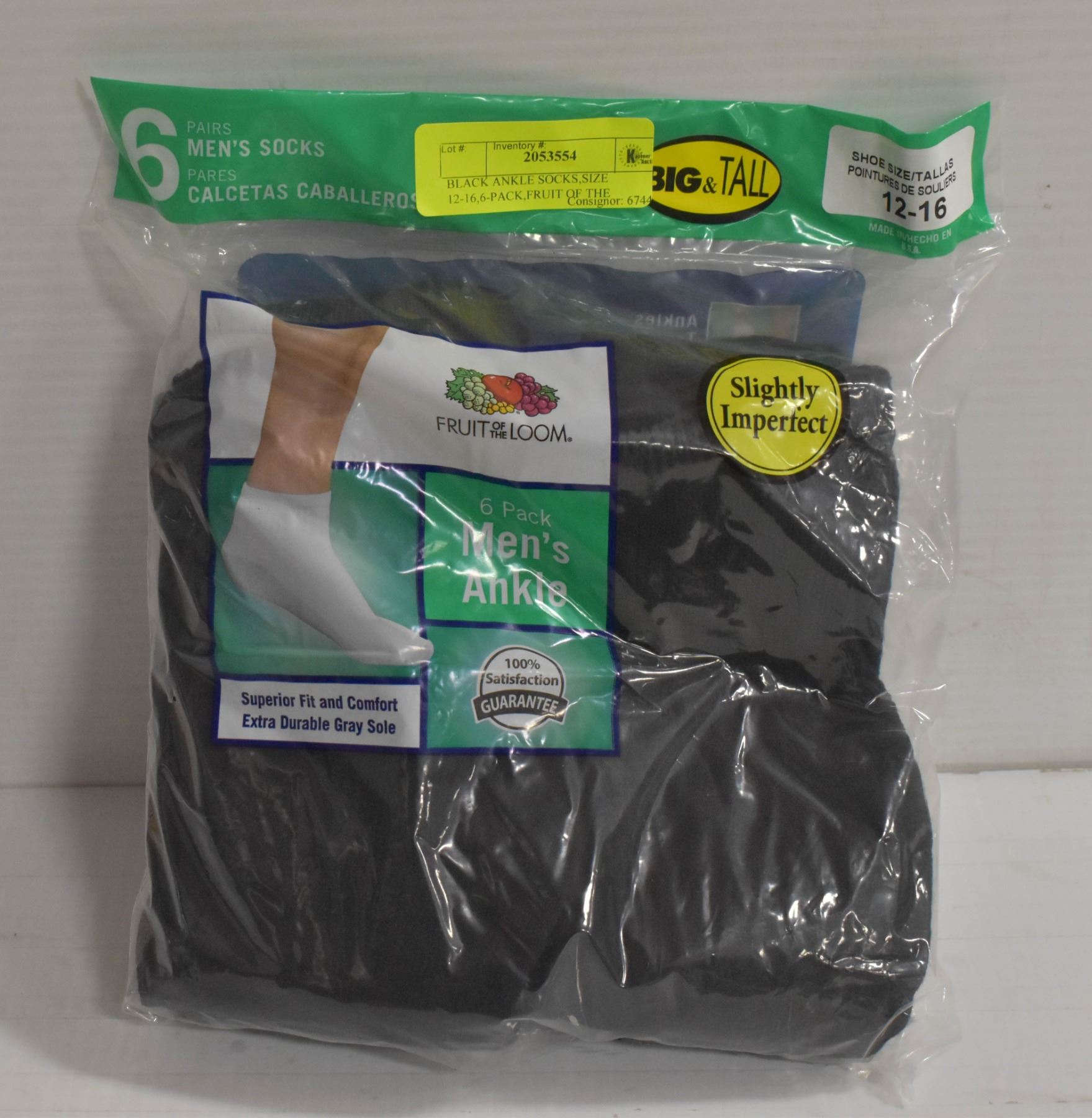 BLACK ANKLE SOCKS,SIZE 12-16,6-PACK,FRUIT OF THE
