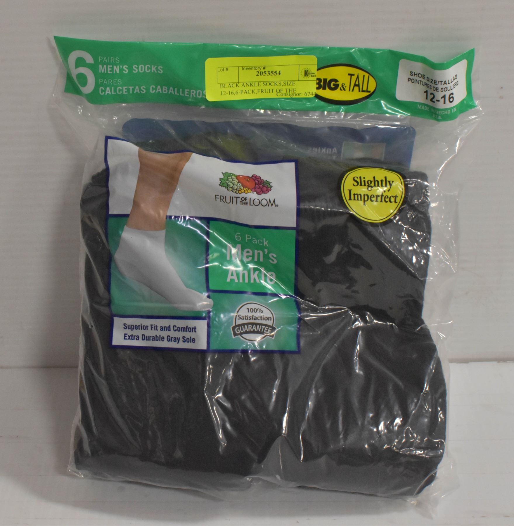 BLACK ANKLE SOCKS,SIZE 12-16,6-PACK,FRUIT OF THE