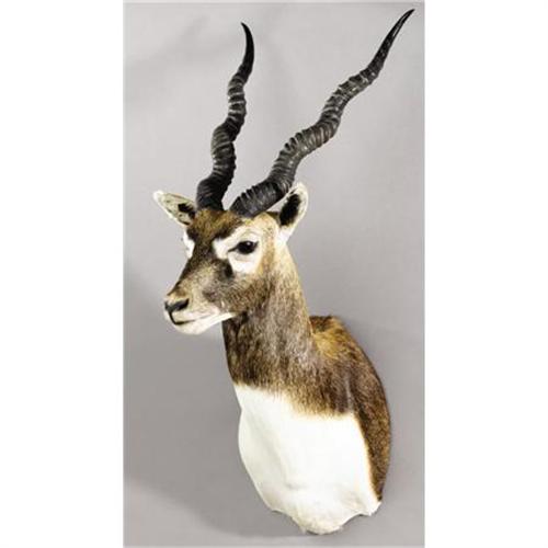 <B>BLACK ANTELOPE SHOULDER MOUNT </B></I><BR> <I>Antilope cervicapra</B></I><BR>This is truly one of the most beautiful of the world's antelopes. India is its homeland, but it now thrives on Exotic Game ranches in the southern U.S. and Argentina. Males are a reddish brown, turning jet black as they get older. This is a mature male with excellent-quality taxidermy. His horns are above average, measuring 12¾ inches tip to tip, and he stands 16½ from the wall and 31½ inches high.<BR><BR><b>Shipping:</b> Requires 3rd Party Shipping (<a target="_blank" href="http://www.heritageauctions.com/common/shipping.php">view shipping information</a>)