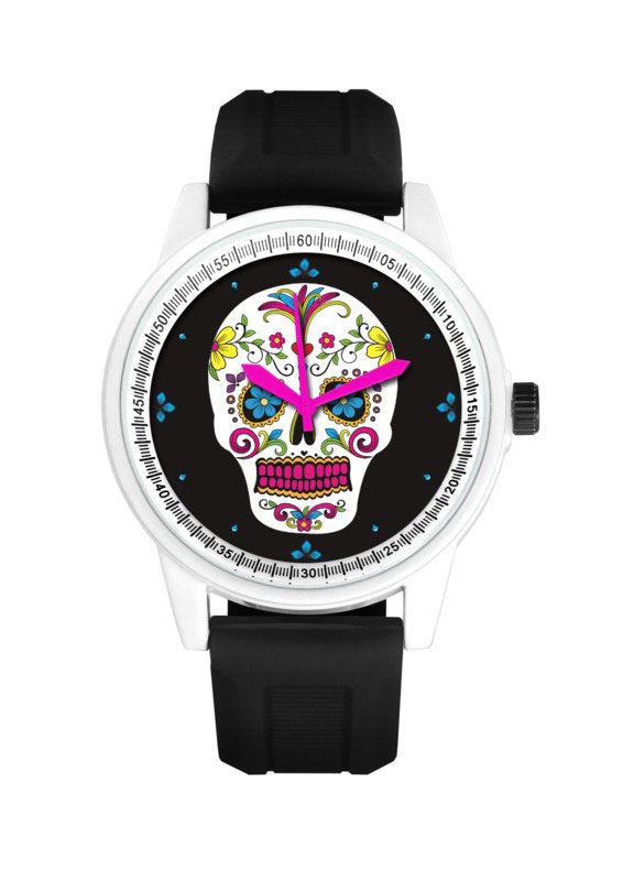 BLACK BAND/WHITE DAY OF THE DEAD WATCH **|**|** BLACK BAND/WHITE DAY OF THE DEAD WATCH THE BAND ID MADE OF COLORFUL SILICON MATERIAL HAS A QUARTZ MOVEMENT THE BAND IS 20mm AND THE CASE IS 45mm COMES IN A COLOR BOX