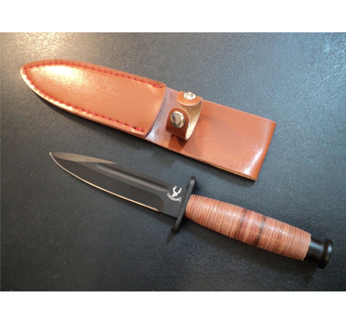 BLACK BLADE BROWN HANDLE KNIFE WITH LEATHER SHEATH