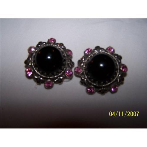 Up for sale is a very lovely pair of Vintage Black Cabochon and Pink Rhinestone Clip On Earrings. They measures 1 inch in diameter. If you would like additional pictures or have any questions, please feel free and do not hesitate to contact me. I am here to help you in any way I can.