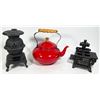 WITH RED ALUMINUM TEA KETTLE, AND BLACK CAST IRON "QUEEN" STOVE 6" TALL***ITEM(S) LOCATED IN LETHBRIDGE ALBERTA. ALL ITEMS IN THIS AUCTION QUALIFY FOR OUR FREE TRANSPORT TO EDMONTON SERVICE. WORLDWIDE SHIPPING AVAILABLE