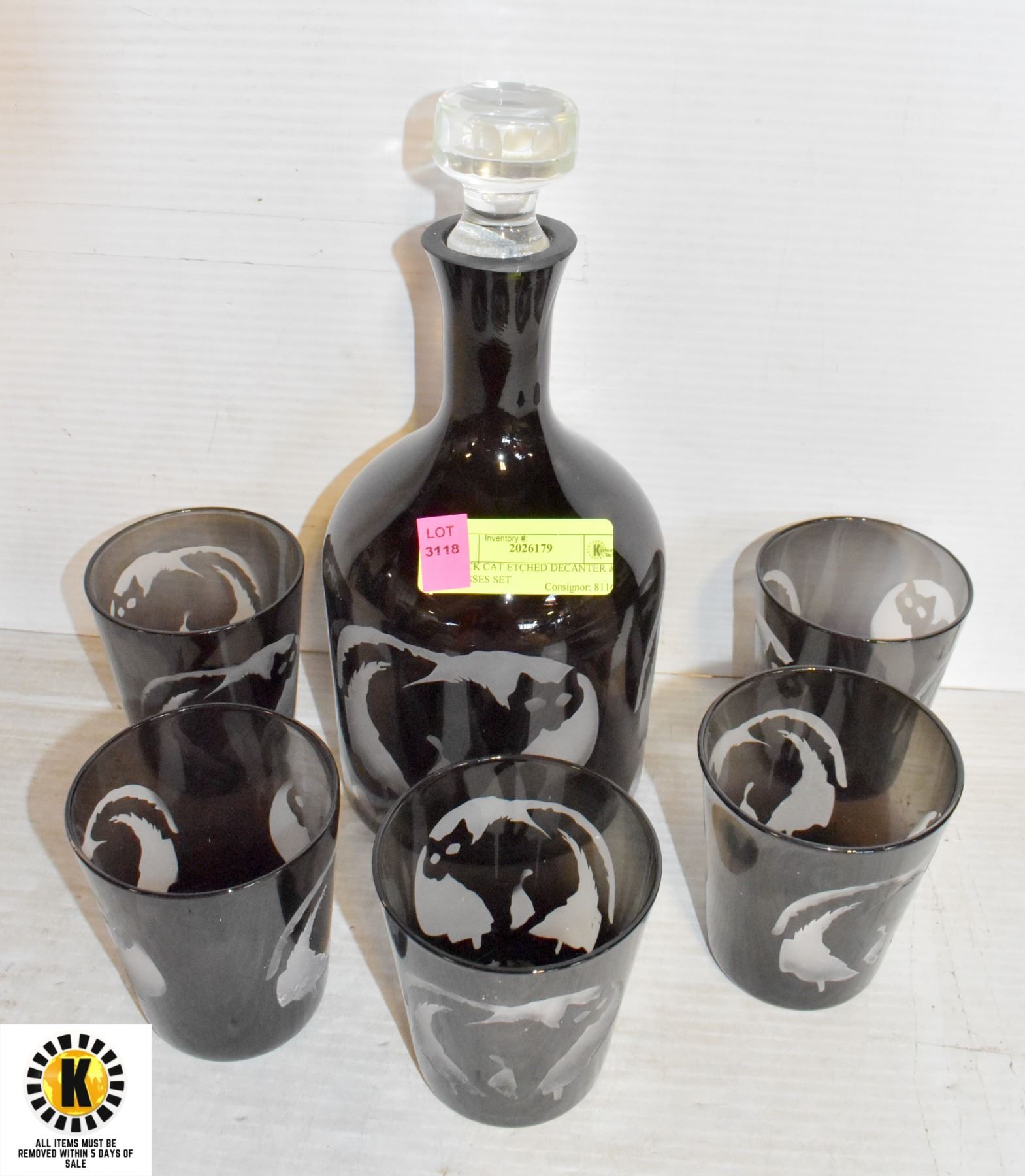 BLACK CAT ETCHED DECANTER & GLASSES SET