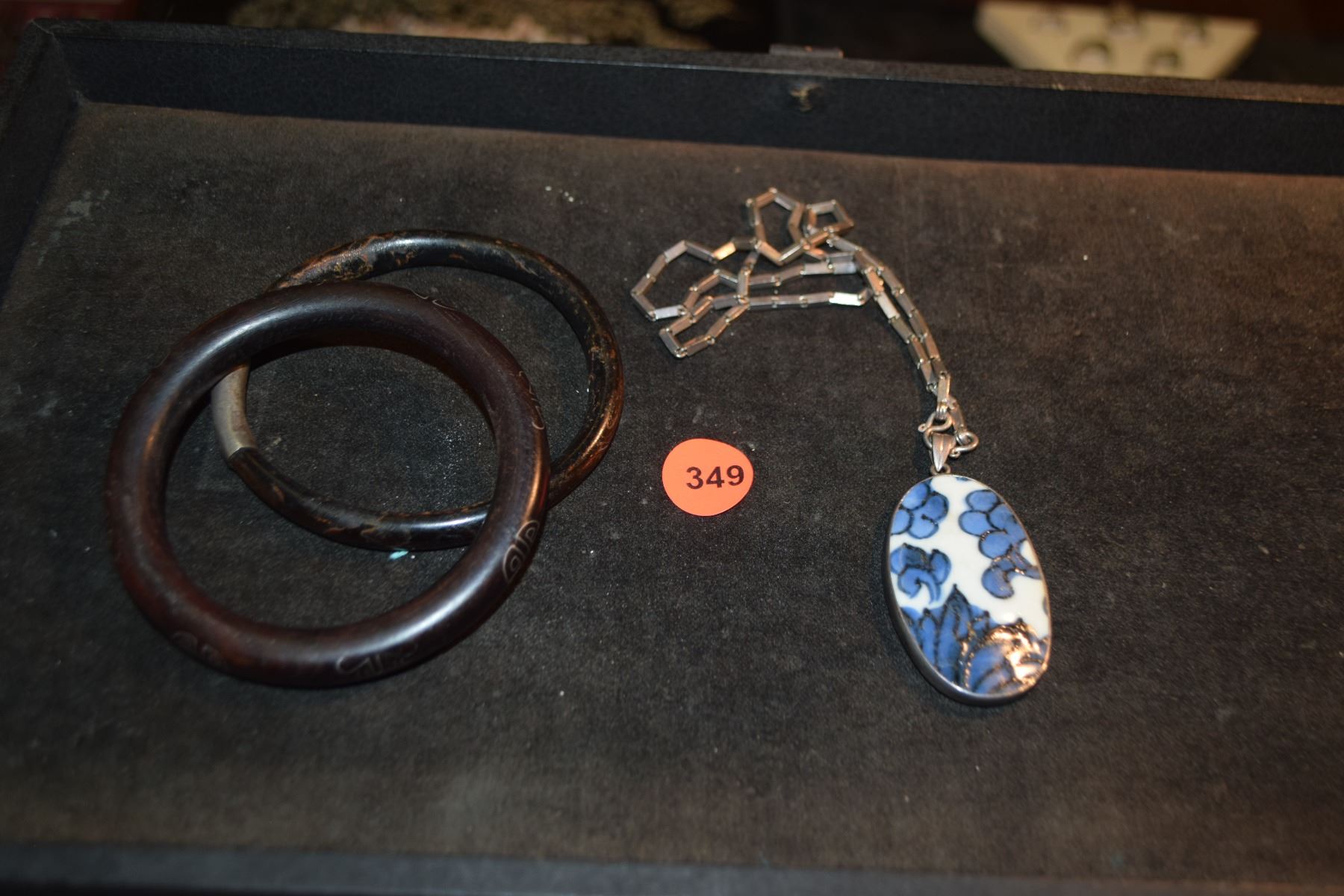 BLACK CORAL, INLAID WOOD BRACELETS (2) & ANTIQUE SHARD PENDANT ON CHAIN (3 PCS)