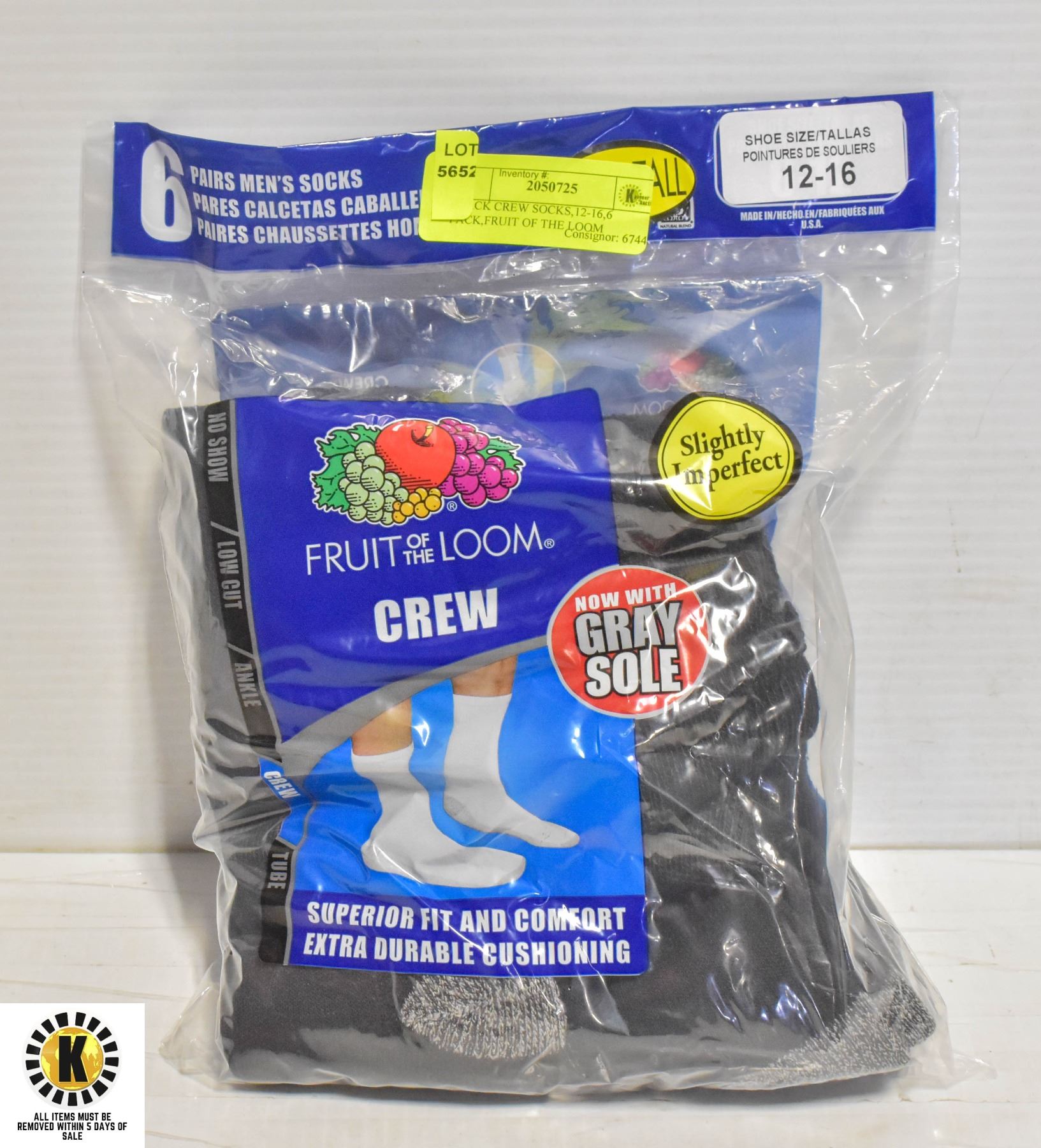 BLACK CREW SOCKS,12-16,6 PACK,FRUIT OF THE LOOM