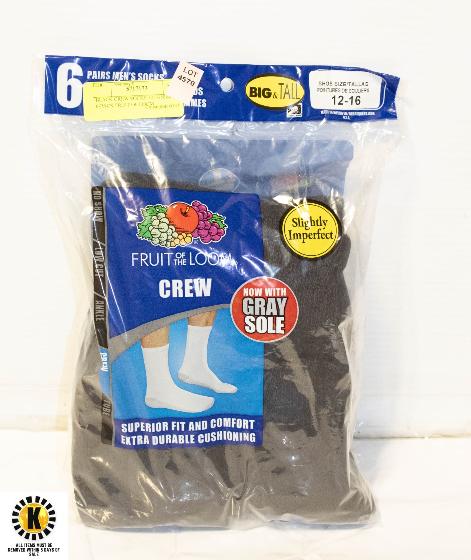 BLACK CREW SOCKS 12-16 SIZE 6-PACK FRUIT OF LOOM