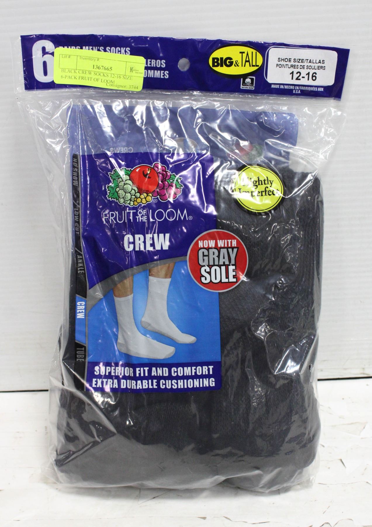 BLACK CREW SOCKS 12-16 SIZE 6-PACK FRUIT OF LOOM