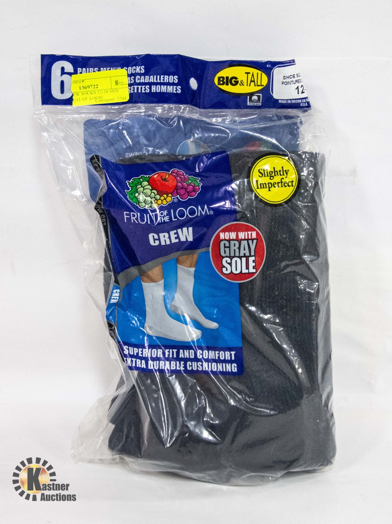 BLACK CREW SOCKS 12-16 SIZE 6-PACK FRUIT OF LOOM