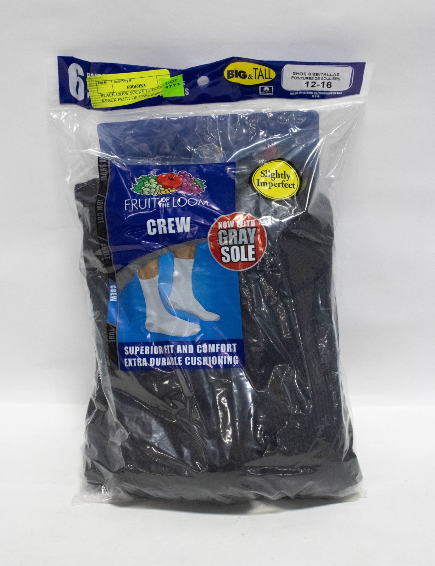 BLACK CREW SOCKS 12-16 SIZE 6-PACK FRUIT OF THE