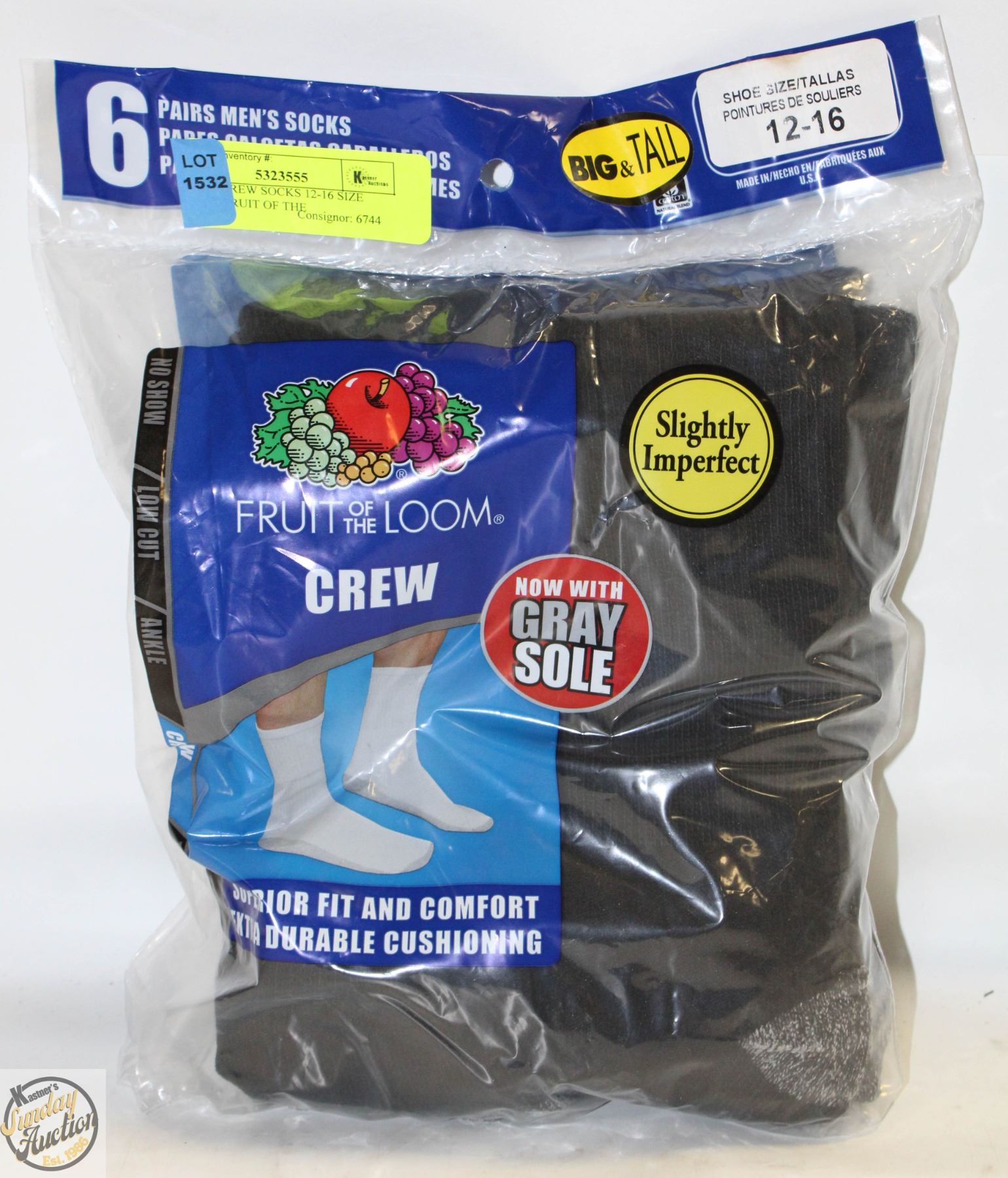 BLACK CREW SOCKS 12-16 SIZE 6-PACK FRUIT OF THE
