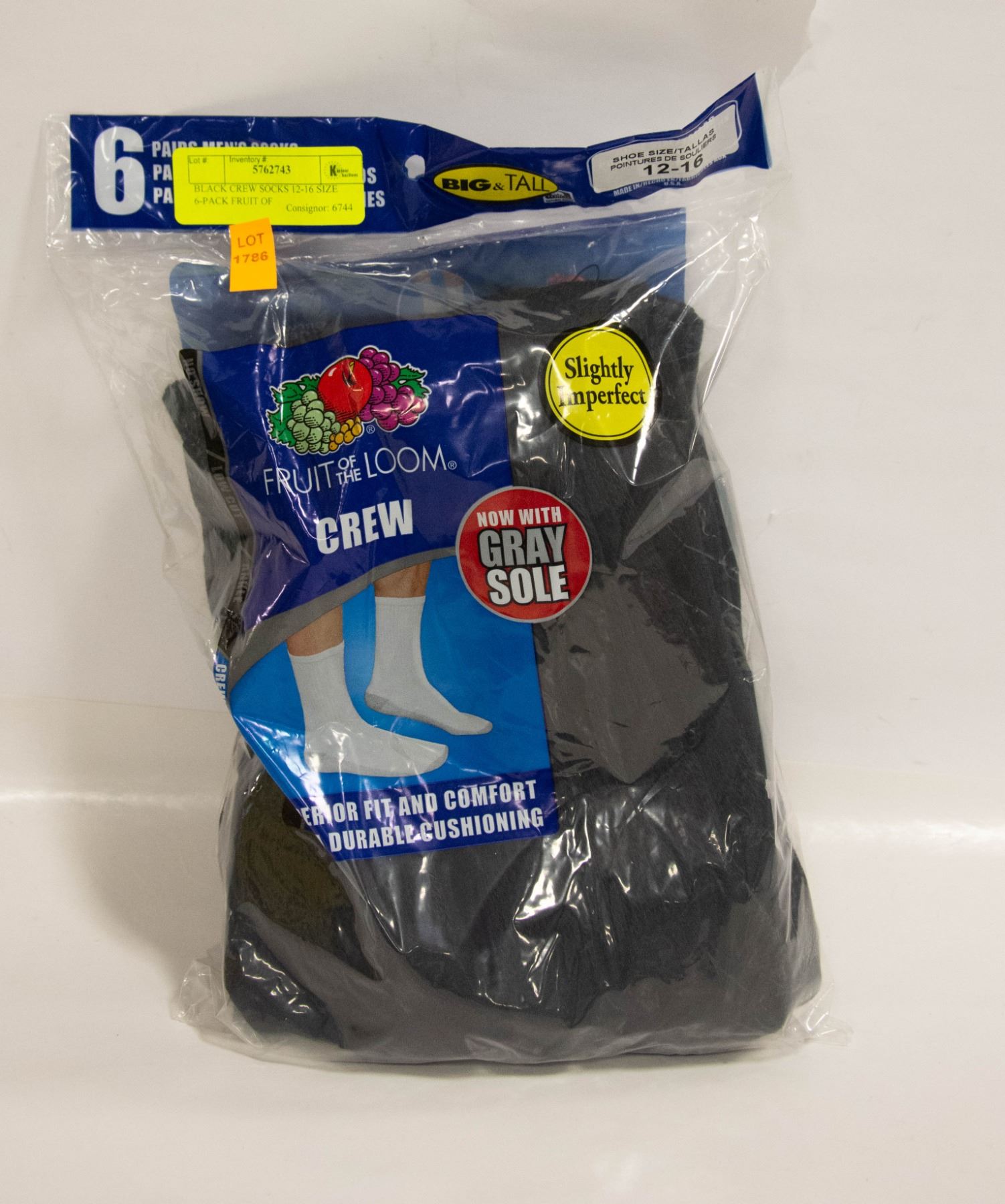 BLACK CREW SOCKS 12-16 SIZE 6-PACK FRUIT OF