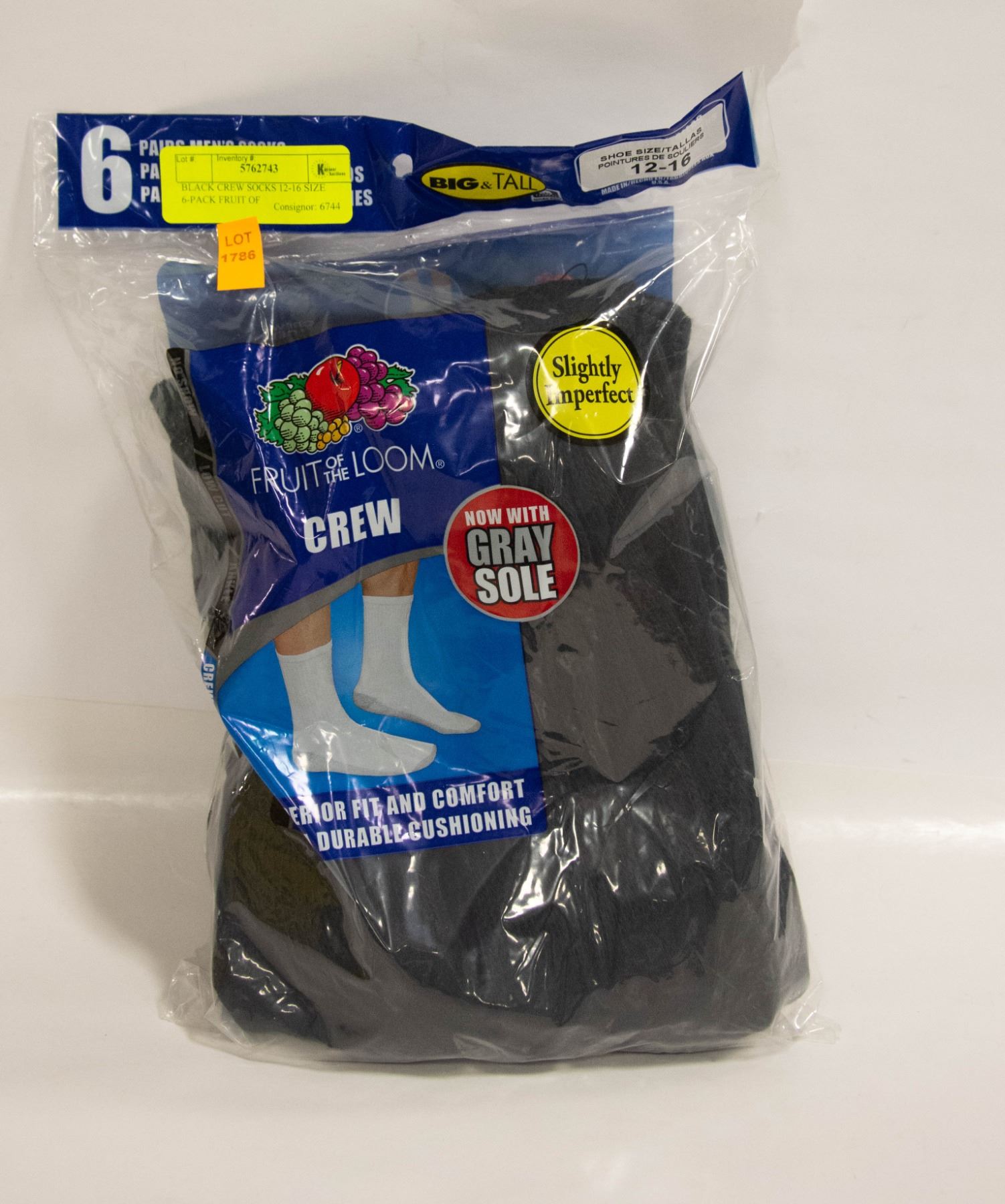 BLACK CREW SOCKS 12-16 SIZE 6-PACK FRUIT OF