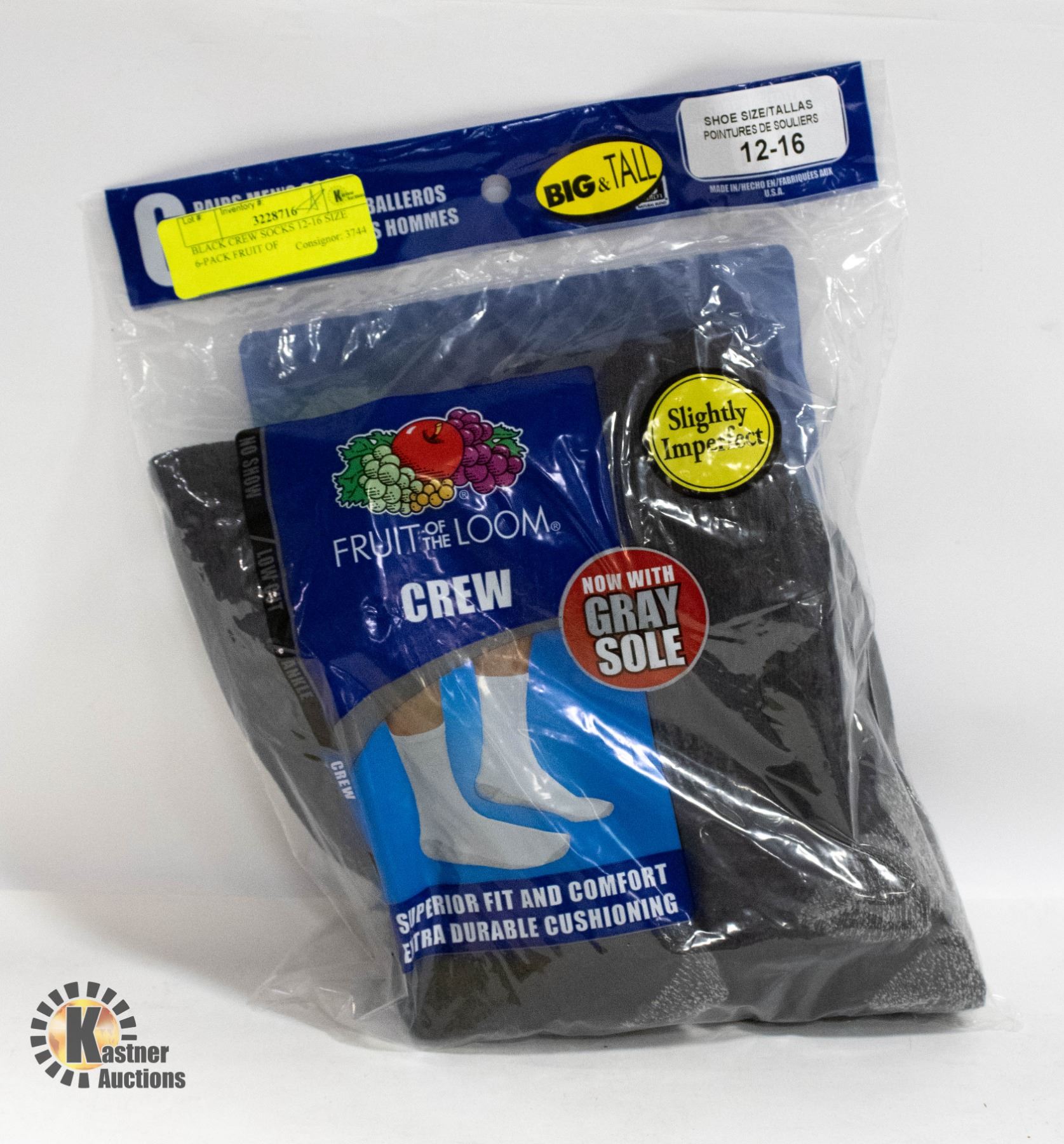 BLACK CREW SOCKS 12-16 SIZE 6-PACK FRUIT OF