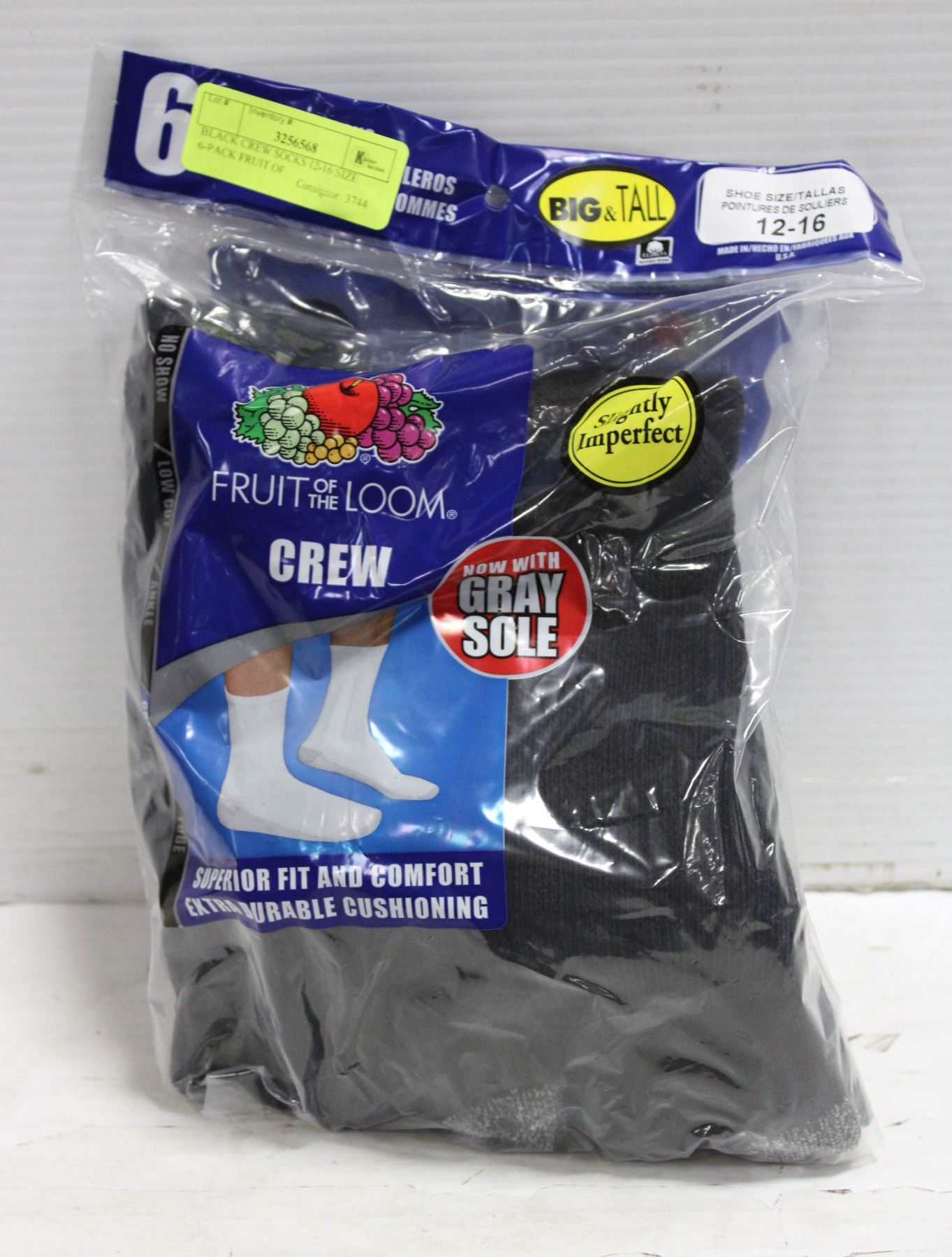 BLACK CREW SOCKS 12-16 SIZE 6-PACK FRUIT OF
