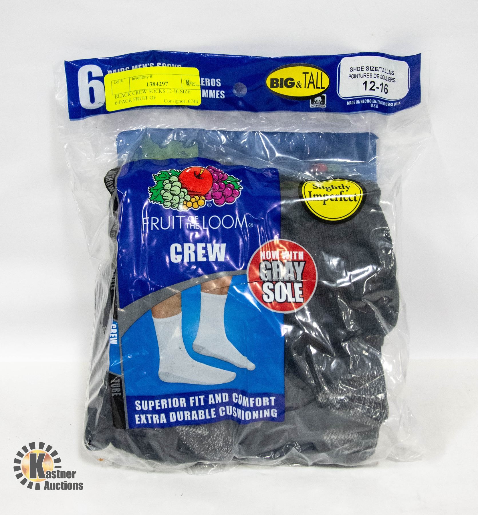 BLACK CREW SOCKS 12-16 SIZE 6-PACK FRUIT OF