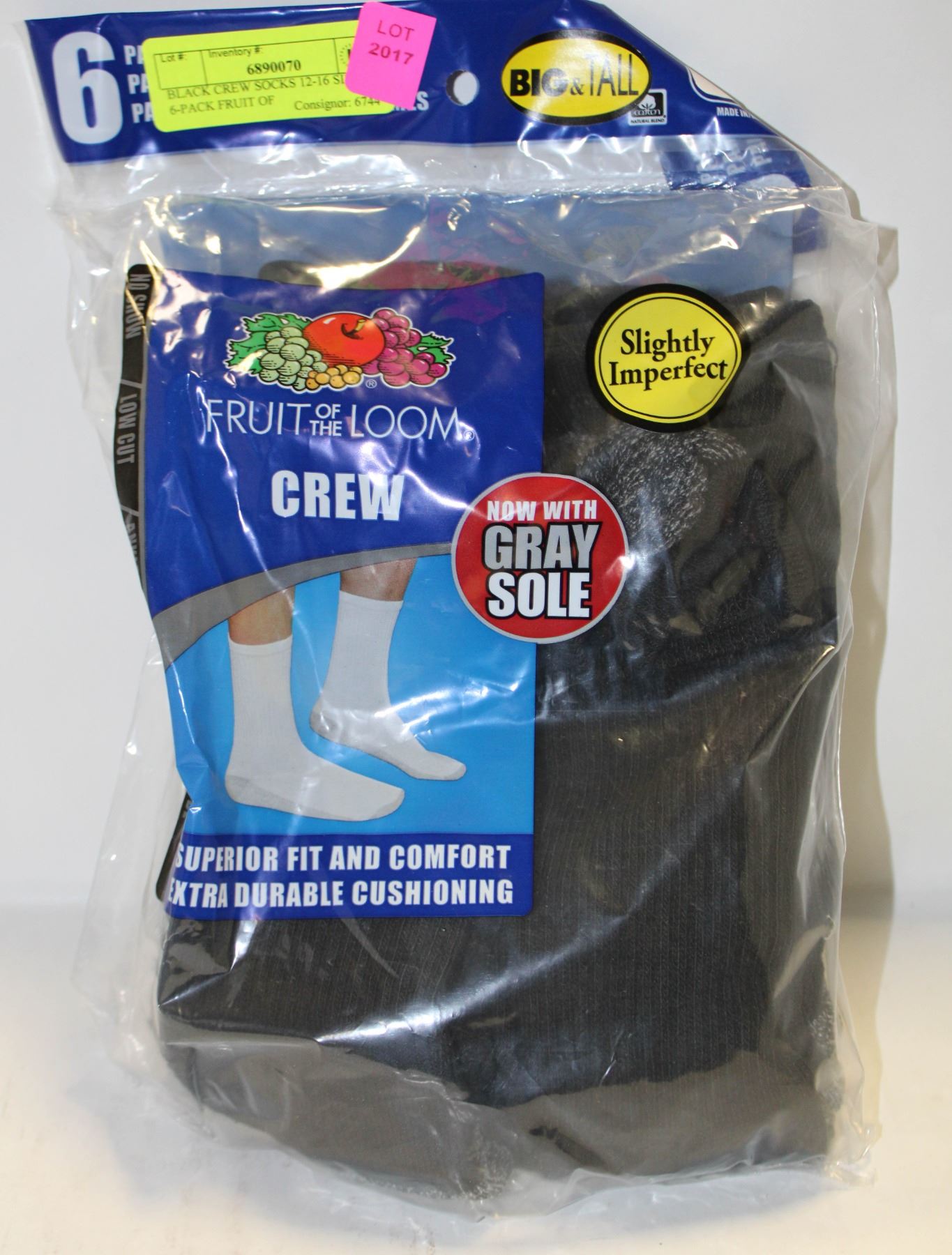 BLACK CREW SOCKS 12-16 SIZE 6-PACK FRUIT OF