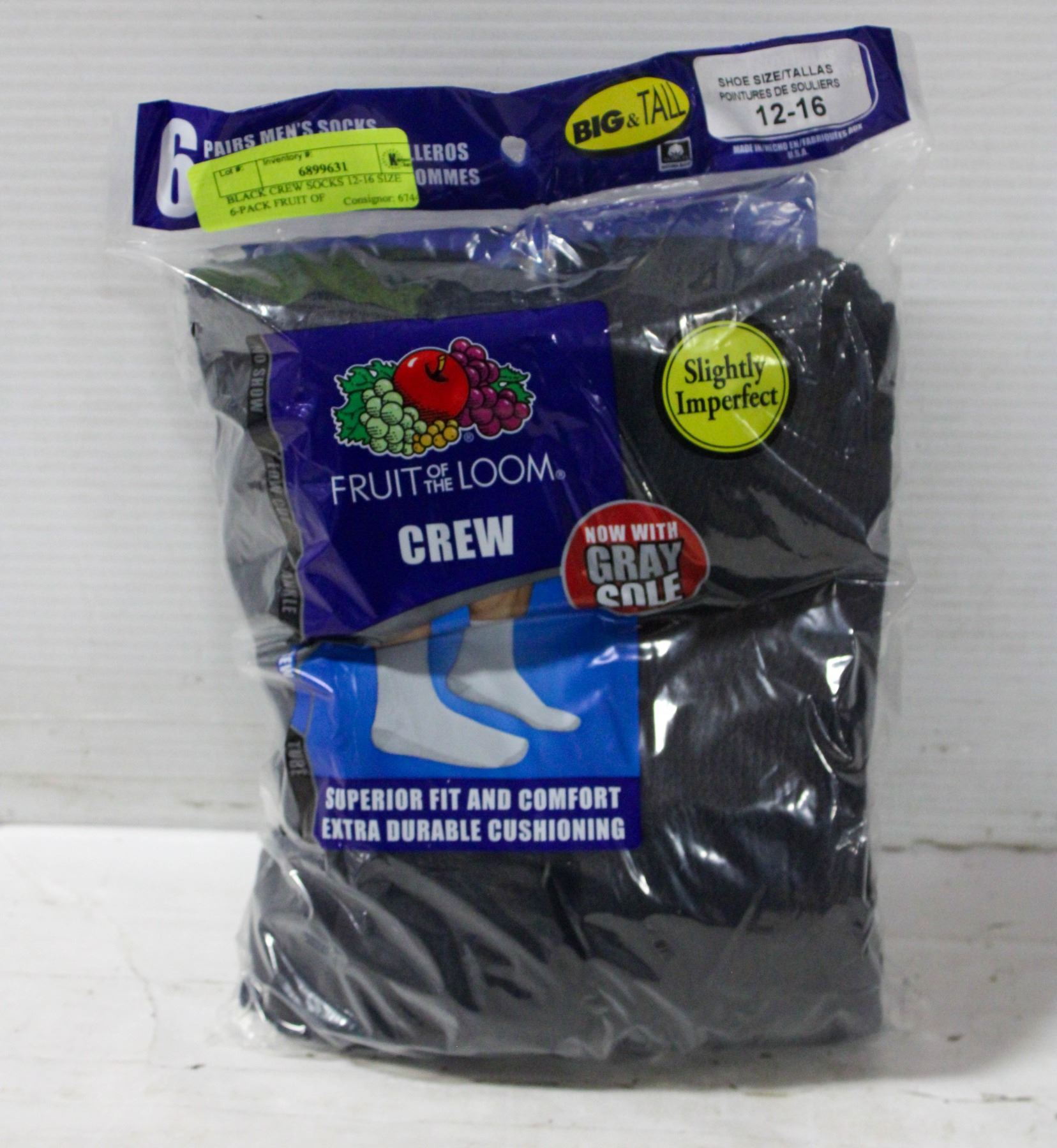 BLACK CREW SOCKS 12-16 SIZE 6-PACK FRUIT OF