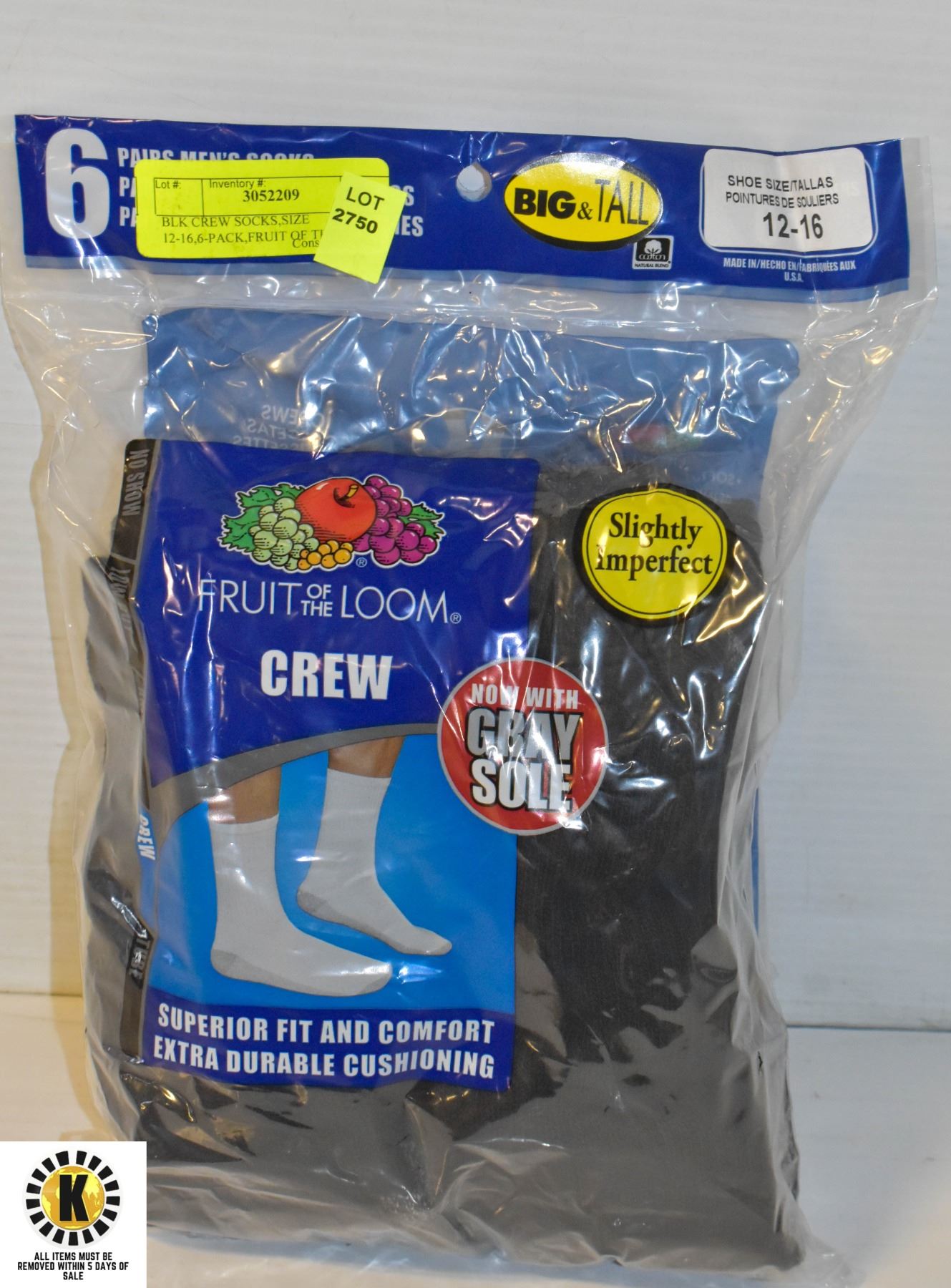 BLACK CREW SOCKS, SIZE 12-16,6-PACK, FRUIT OF THE
