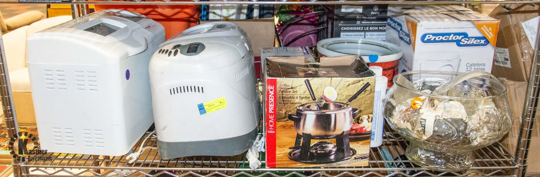 BLACK & DECKER ALL IN ONE BREAD MAKER, DURABRAND 2 SLICE TOASTER, PROCTOR SILEX 12 CUP COFFEE MAKER, PHILLIPS CROCK WATCHER CROCK POT, SANTA FE HOT DIP POT, HOME PRESENCE STAINLESS STEEL FONDUE SET **ALL ITEMS MUST BE REMOVED BY 5PM SATURDAY, JULY 29TH 2023. ALL REMAINING ITEMS WILL BE SUBJECT TO A $6.00 PER DAY STORAGE CHARGE. ANY ITEMS REMAINING AFTER MONDAY, AUGUST 14TH, 2023 WILL BE CONSIDERED FORFEITED. NO REFUNDS WILL BE ISSUED FOR FORFEITED ITEMS. TO SCHEDULE A PICK UP APPOINTMENT CLICK HERE