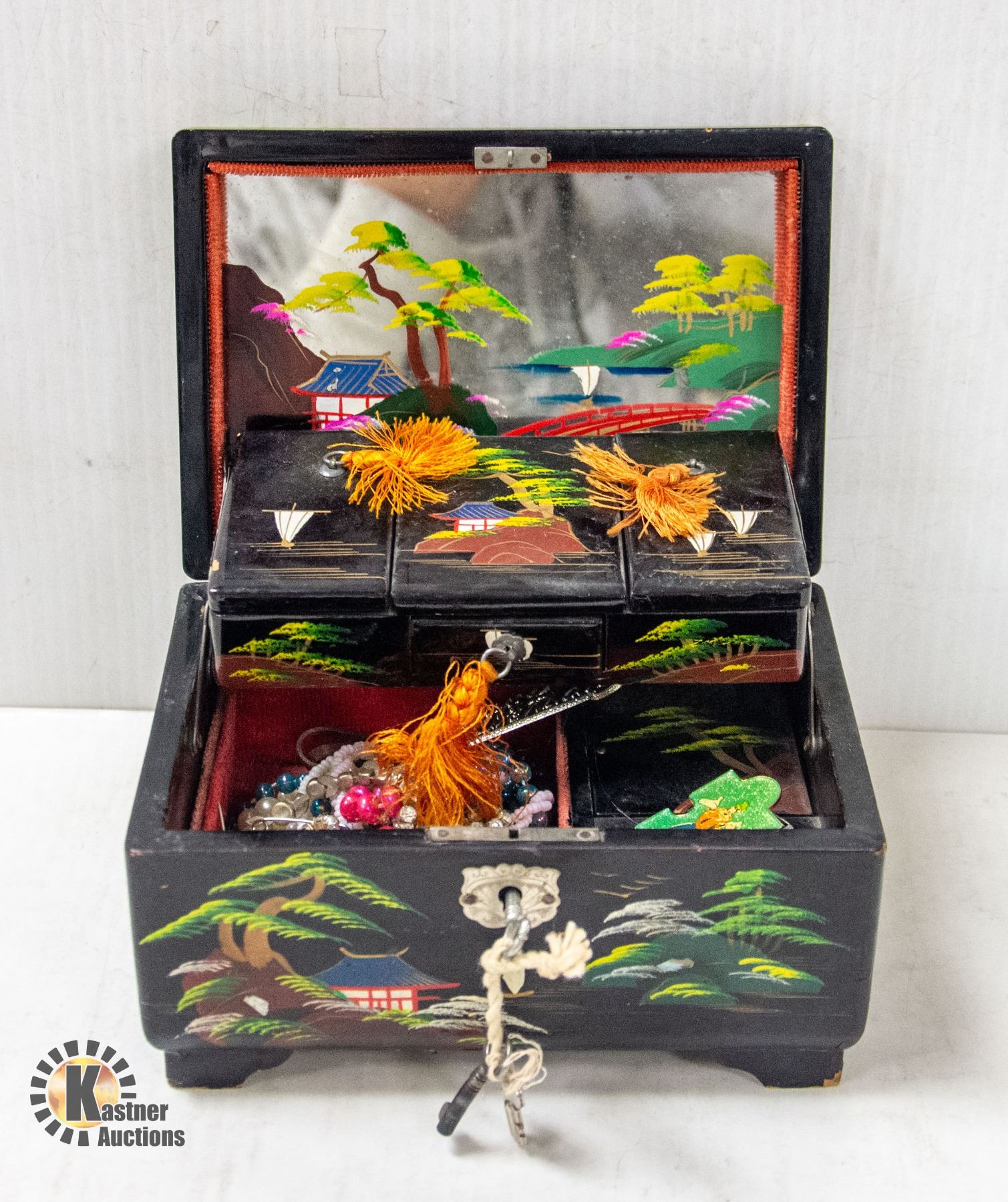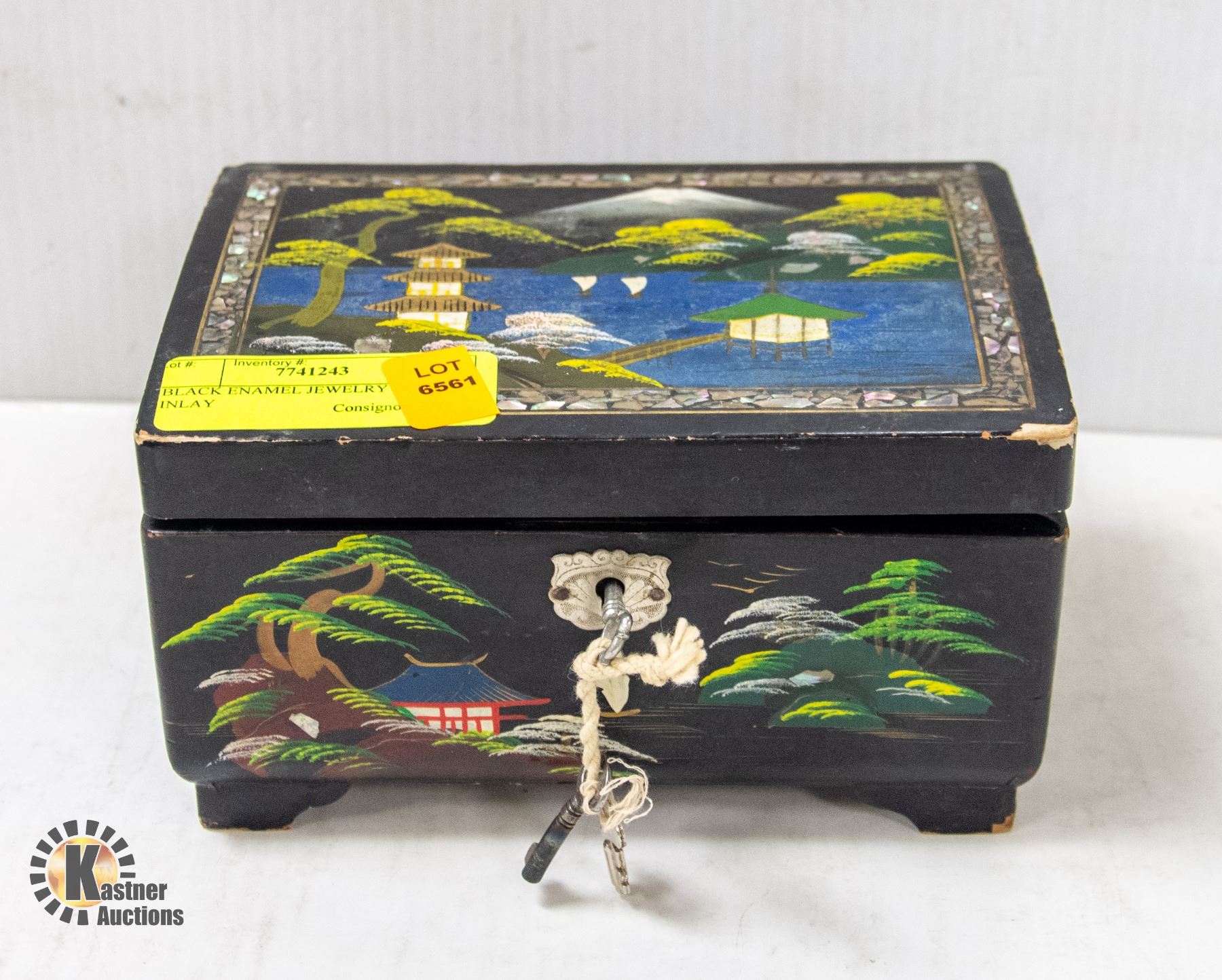 BLACK ENAMEL JEWELRY BOX W INLAY