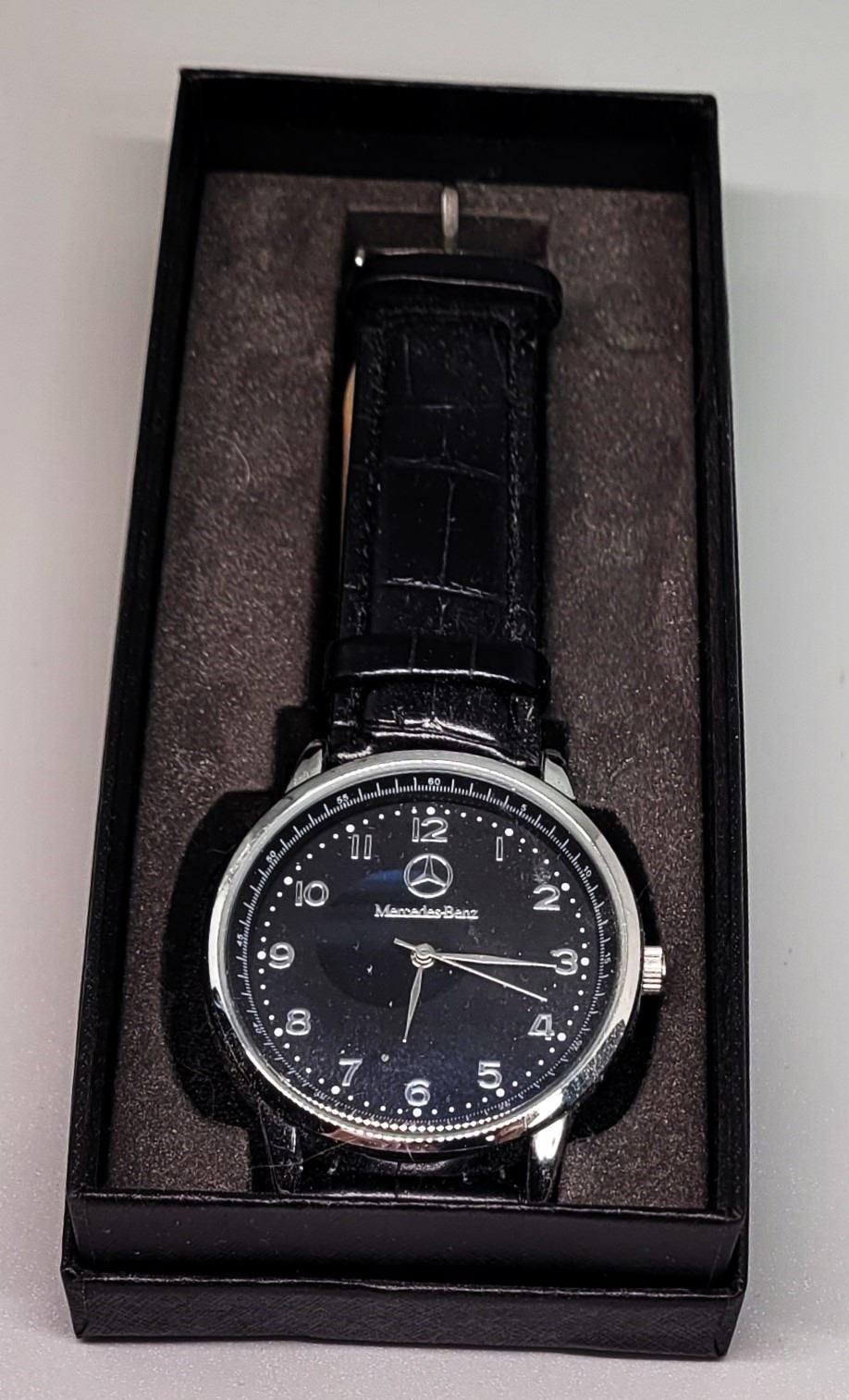 AND FACE OF GENUINE MERCEDES BENZ WATCH WITH BLACK LIZARD LEATHER BAND. JEWELLERY