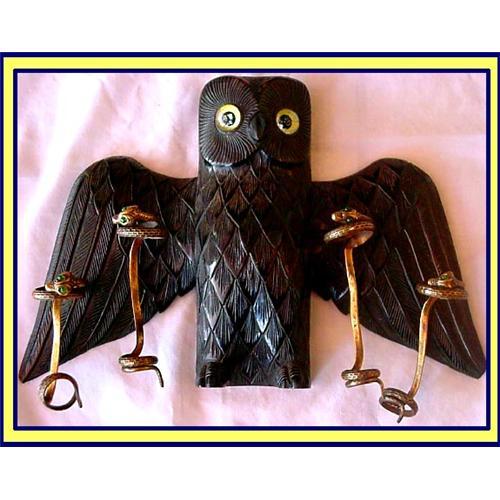 Black Forest carved wood hanging pipe rack / holder in the form of an owl. Brass snake holders with emerald glass eyes. Germany 19th century.<BR>7 1/2inches top to bottom and 10inches at widest point.<BR>Owl with outstretched wings, big glass eyes. Fabulous hand carving all over his face and body in styalised patterns. 4 attached brass snakes twist and twirl from his wings. Pipes would be held in their coils. Snakes have moulded scales and features. <BR>Condition is excellent. No damage of any sort.