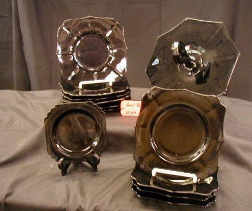BLACK GLASS LOT INCLUDES WESTMORELAND CTR. HNDL. TRAY, (6) PLATE 8in,(4) PLATE 7in, (1) DESSERT PLATE 5 1/2in, 12 PCS