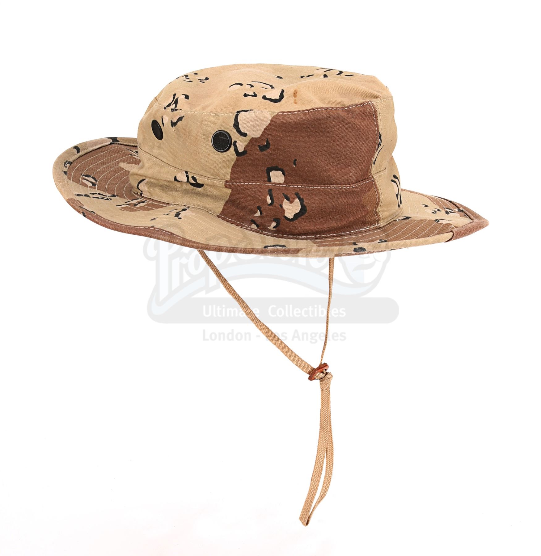 Private Blackburn's (Orlando Bloom) screen-matched camo hat from Ridley Scott's war film Black Hawk Down. Blackburn wore his hat while being introduced to Sergeant Eversmann (Josh Hartnett) at the shooting range. It is screen-matched by the placement of the camouflage markings and stitching. The hat is desert camouflage decorated, has a wide brim and features a chin strap with a leather toggle. The front of the hat features insignia for the rank of Private First Class, and a label within reads "Blackburn" and "Black" handwritten in pen. It is marked size "7 1/4". There is some wear, including loose fibres and some minor staining, most notably on the top of the hat.