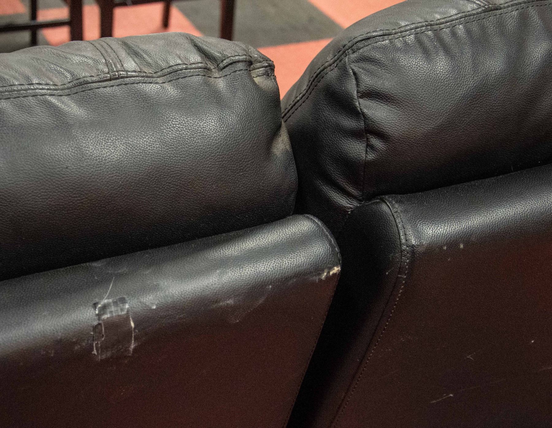 FIRM COMFORTABLE CUSHIONS, HIGH QUALITY FURNITURE (67"L X 40"W X 37"H). *COUCH HAS TEAR IN BACK.*