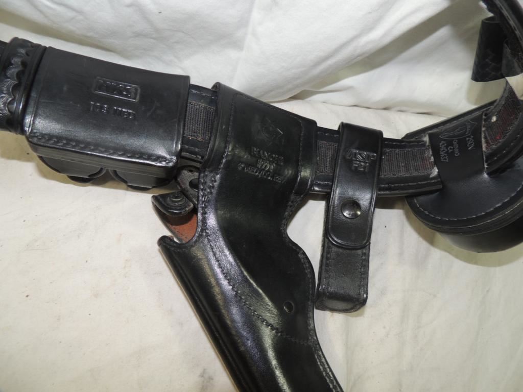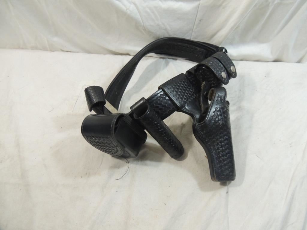 BLACK LEATHER POLICE OFFICER, SECURITY, OR MILITARY BELT WITH GUN HOLSTER, HANDCUFF HOLDER, BILLY CLUB HOLDER, PEPPER STRAY HOLDER, FAST LOADER, LEATHER WORK BELT, MEDIUM, AS SHOWN SEE PHOTO FOR MORE DETAILS.