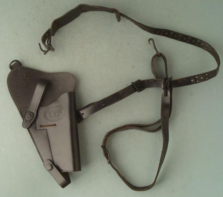 BLACK LEATHER SHOULDER HOLSTER WITH ALL STRAPS--FRONT MARKED "US" IN OVAL * MAKER MARKED "NORDIC MFG CO"