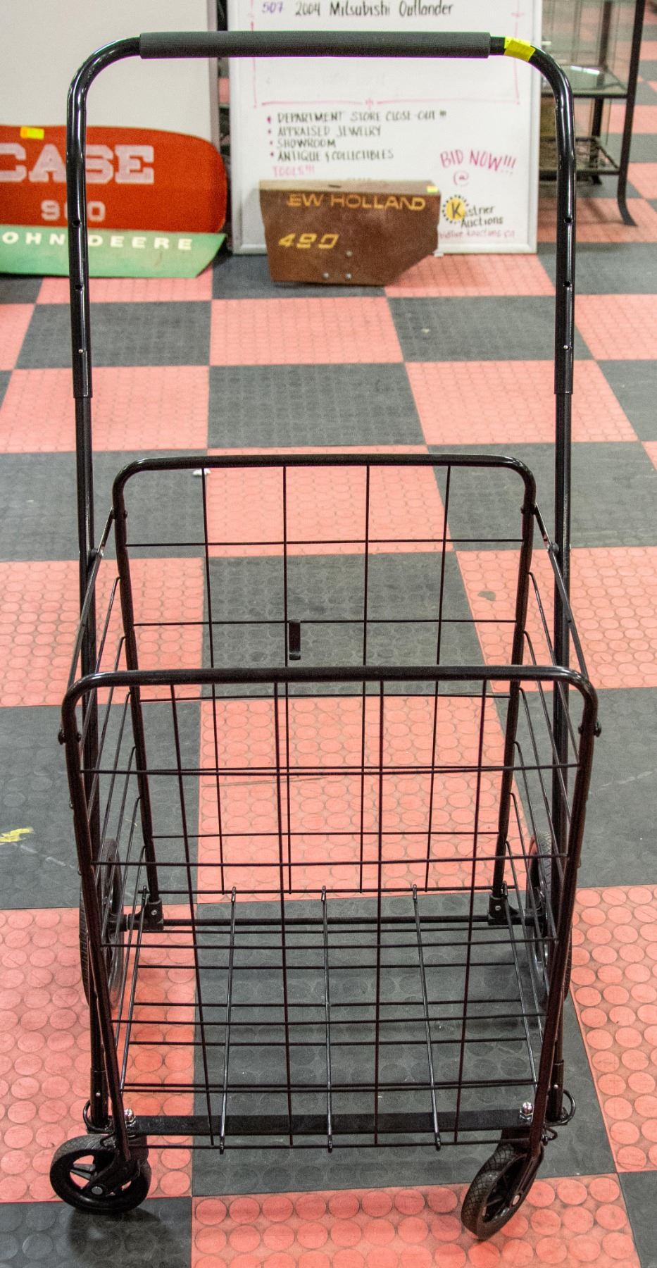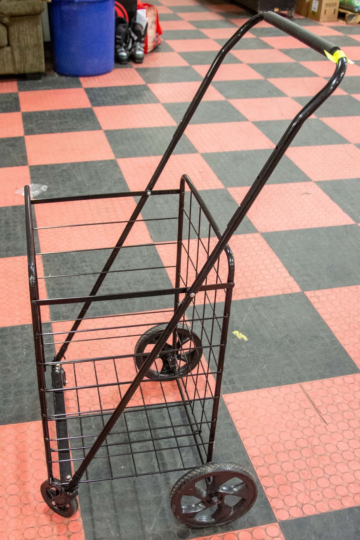 ADJUSTABLE HEIGHT, PADDED HANDLE, 8.5"-HEAVY DUTY REAR WHEELS, 4.5"-SWIVEL FRONT WHEELS (16"L X 18"W X 23"H BASKET) AND 45"-HEIGHT WITH HANDLE EXTENDED