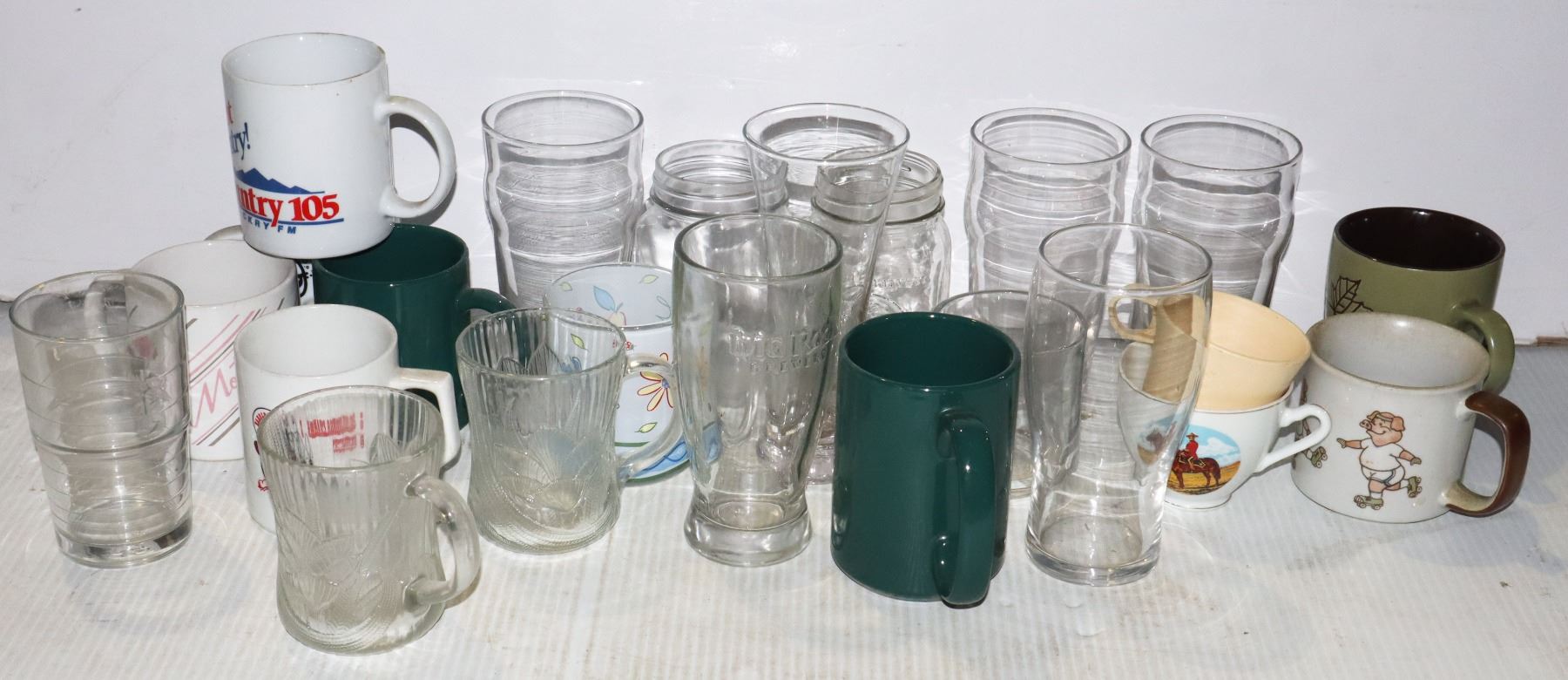 BLACK MILK CRATE FULL OF ASSORTED GLASSES AND MUGS