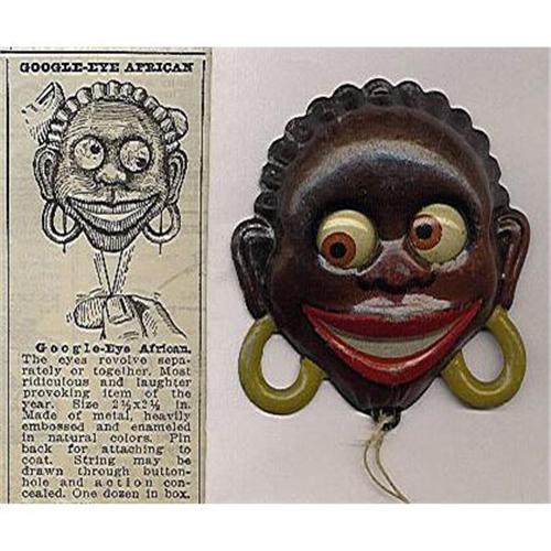 BLACK FACE "GooGLE EYE" TIN TOY, shown here with an ad from a vintage novelty catalog for this item, accurately described in the catalog as "Google-Eye African, The eyes revolve separately or together. Most ridiculous and laughter provoking item of the year. Size 2-1/2 x 2-1/2 in. Made of metal, heavily embossed and enameled in natural colors. Pin back for attaching to coat. String may be drawn through button hole and action concealed." Tin shows some minor shelf wear/scrathes, but nevertheless very displayable. Marked "Made in Germany," circa 1910s-1920s.