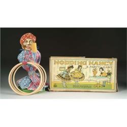 BLACK NODDING NANCY PARTY GAME BY PARKER BROS. A mammy with her bandana a pipe in her mouth is a fixed atop wooden base, the object being to throw the wooden ringlets over her pipe. SIZE: 12”. CONDITION: Toy itself is near mint, box lid shows distressing to flaps. JL 1-3445 (200-400)
