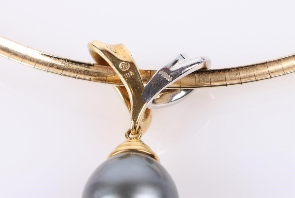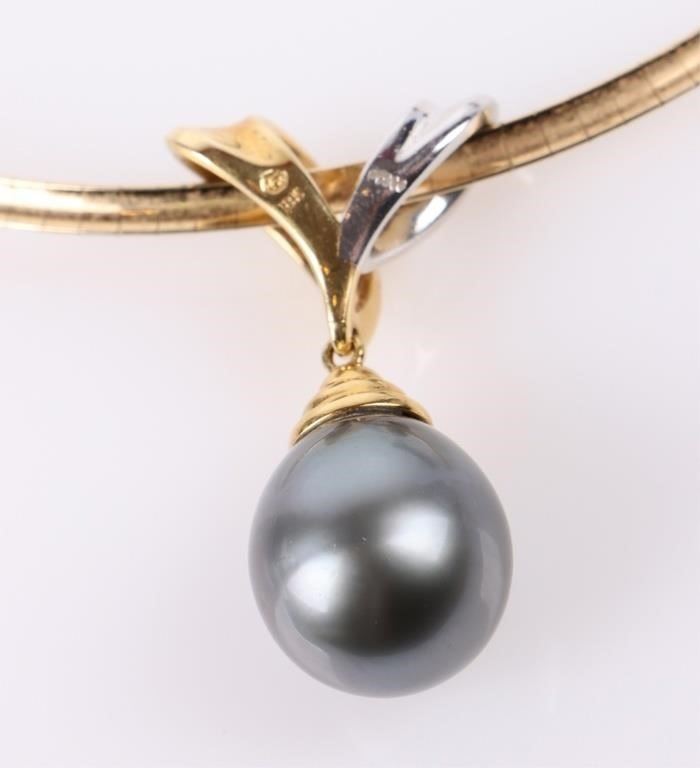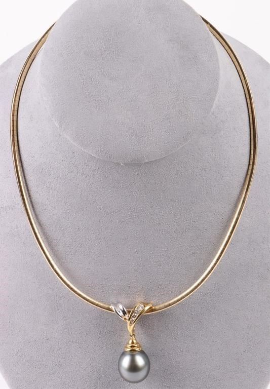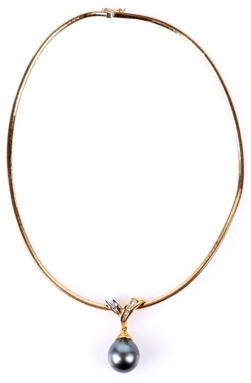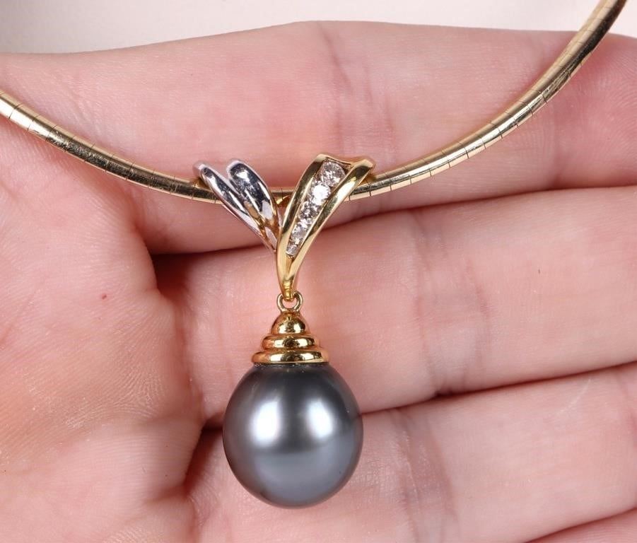 Black pearl diamond 14k yellow gold ladies necklace with 15.8mm black pearl, one 0.02ct round diamond, one 0.03ct round diamond, 0.04ct round diamonds, one 0.06ct round diamond, and one 0.08ct round diamonds.