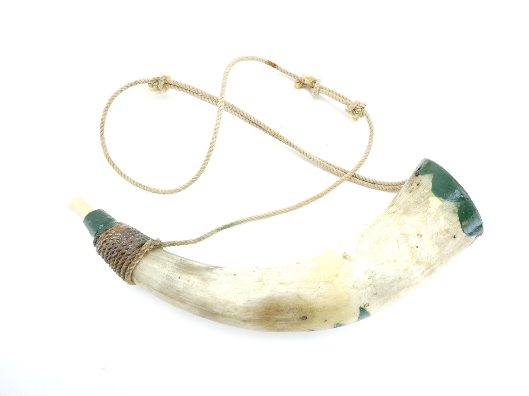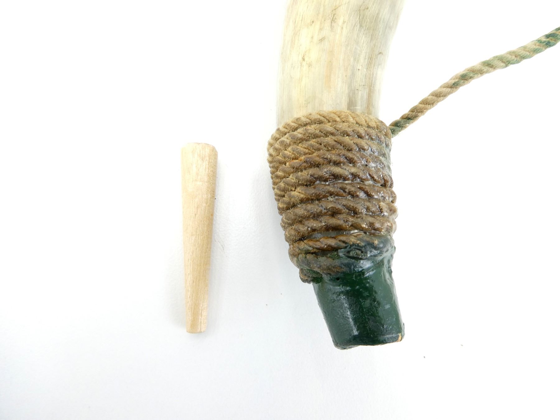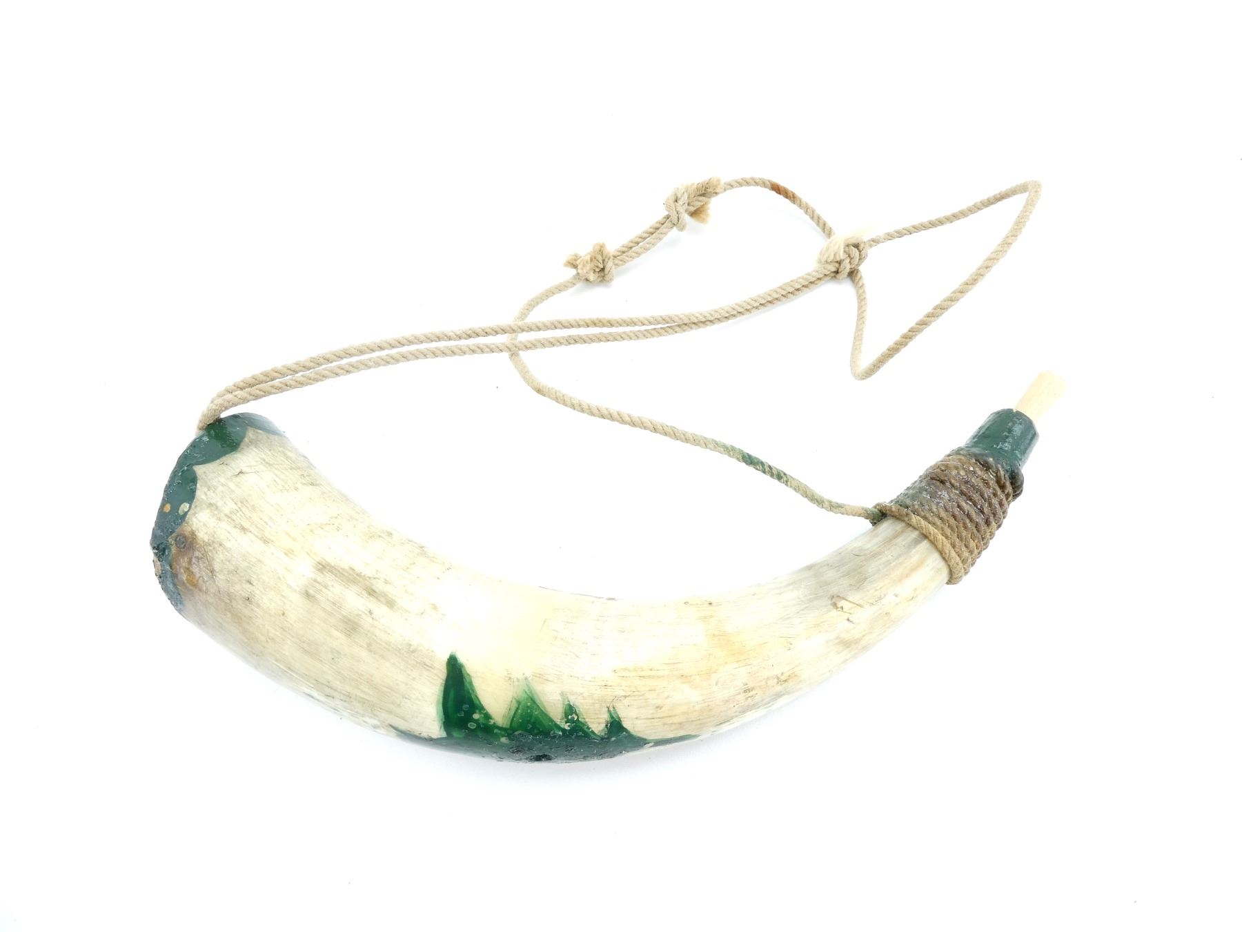 (1) BLACK POWDER HORN WITH GREEN PAINTED DESIGN, WOODEN CAP & LEATHER THONG, OAL APPROX. 7.5". SEE PHOTOS.